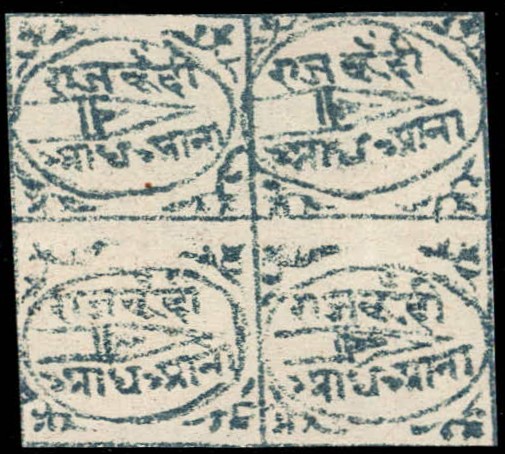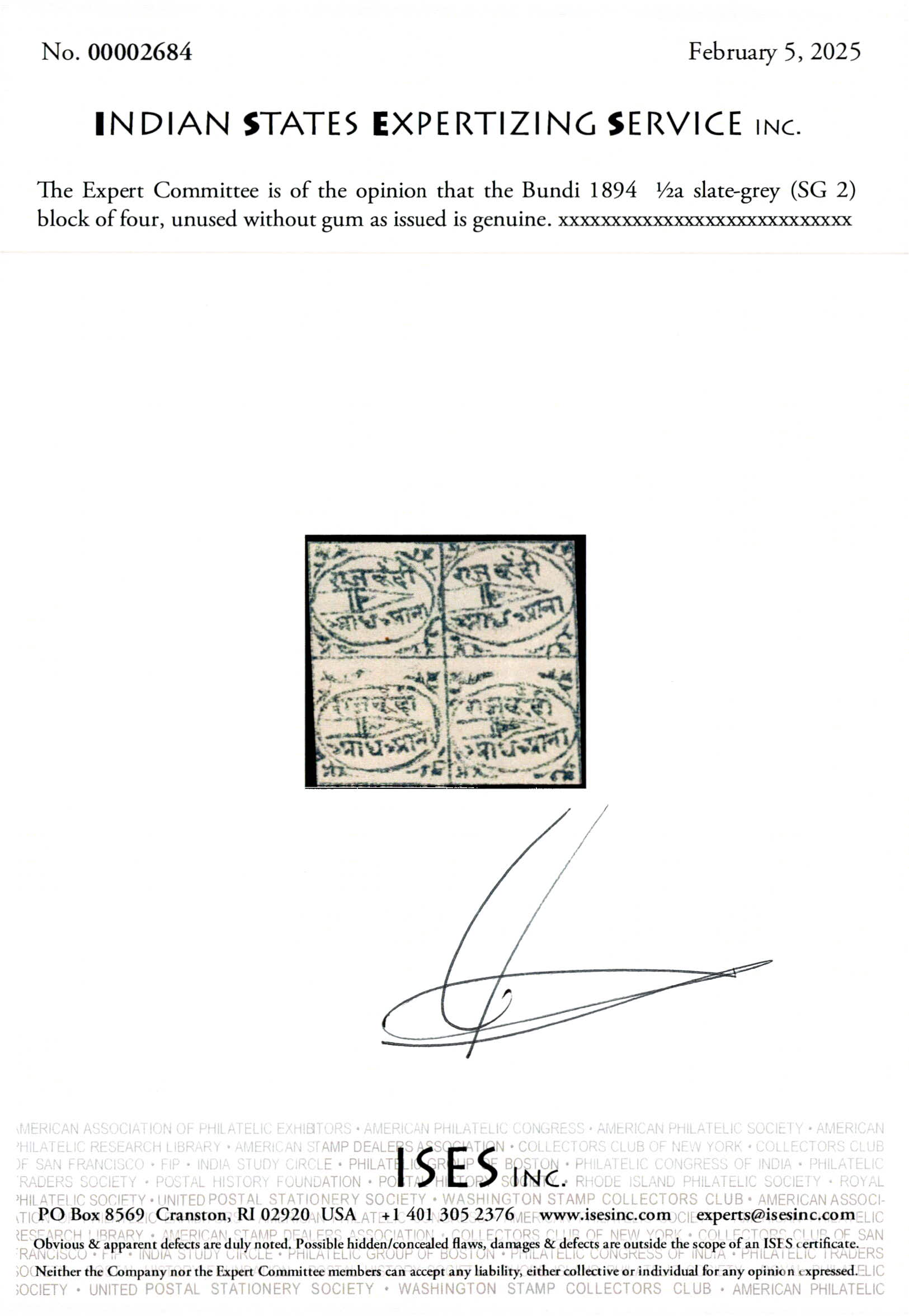 1894 ½a slate-grey block of four. Unused without gum as issued. 2025 ISES certificate.