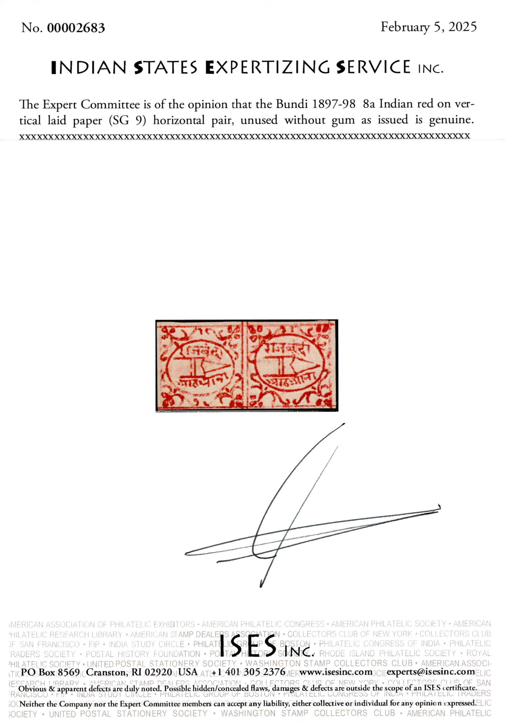 1897-98 8a Indian red on vertical laid paper, horizontal pair. Unused without gum as issued. 2025 ISES certificate.