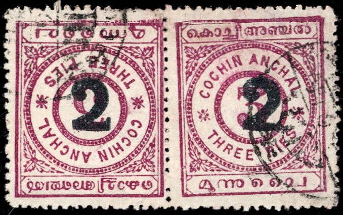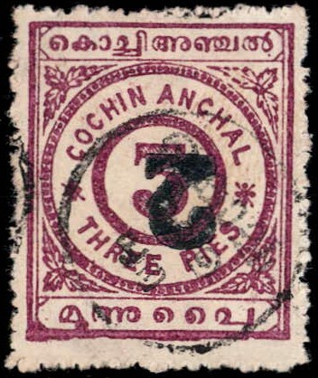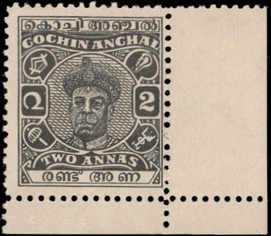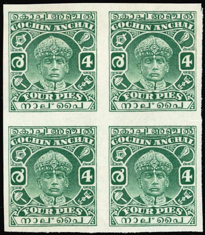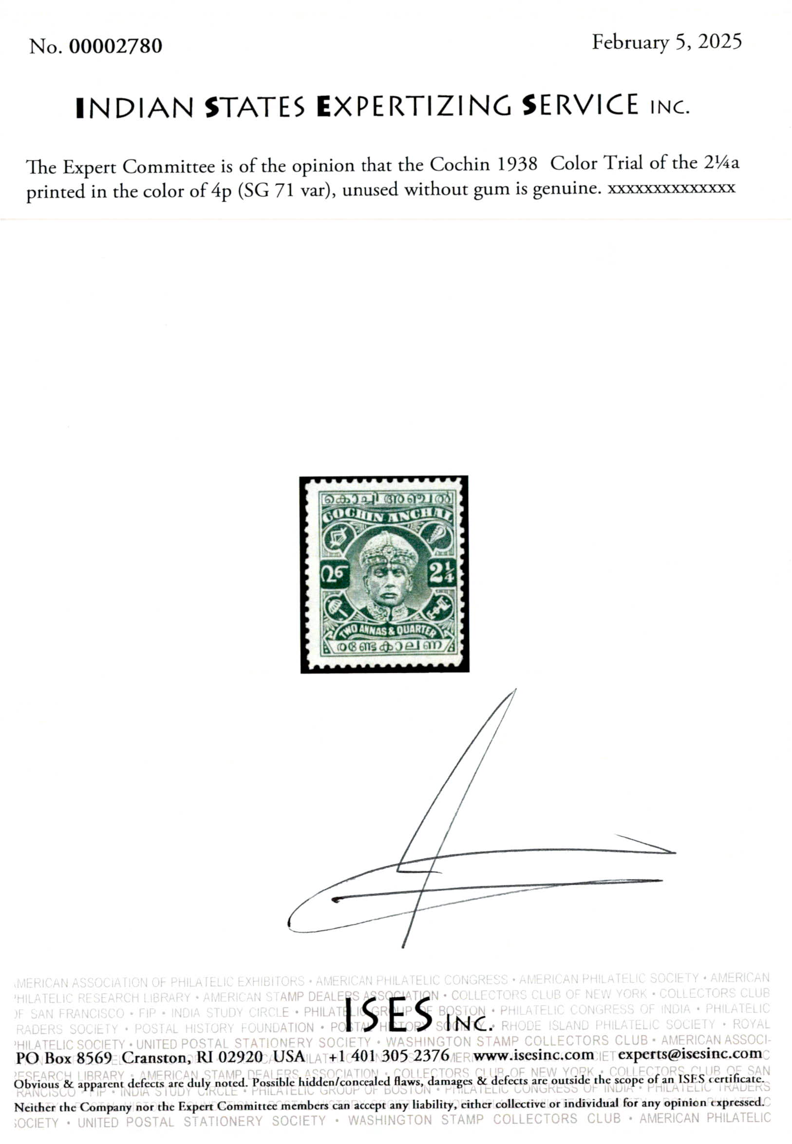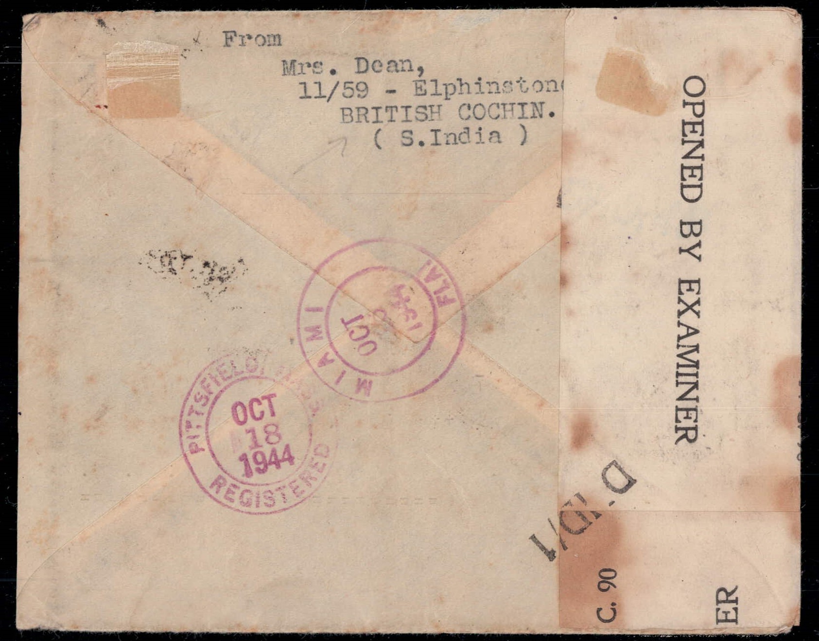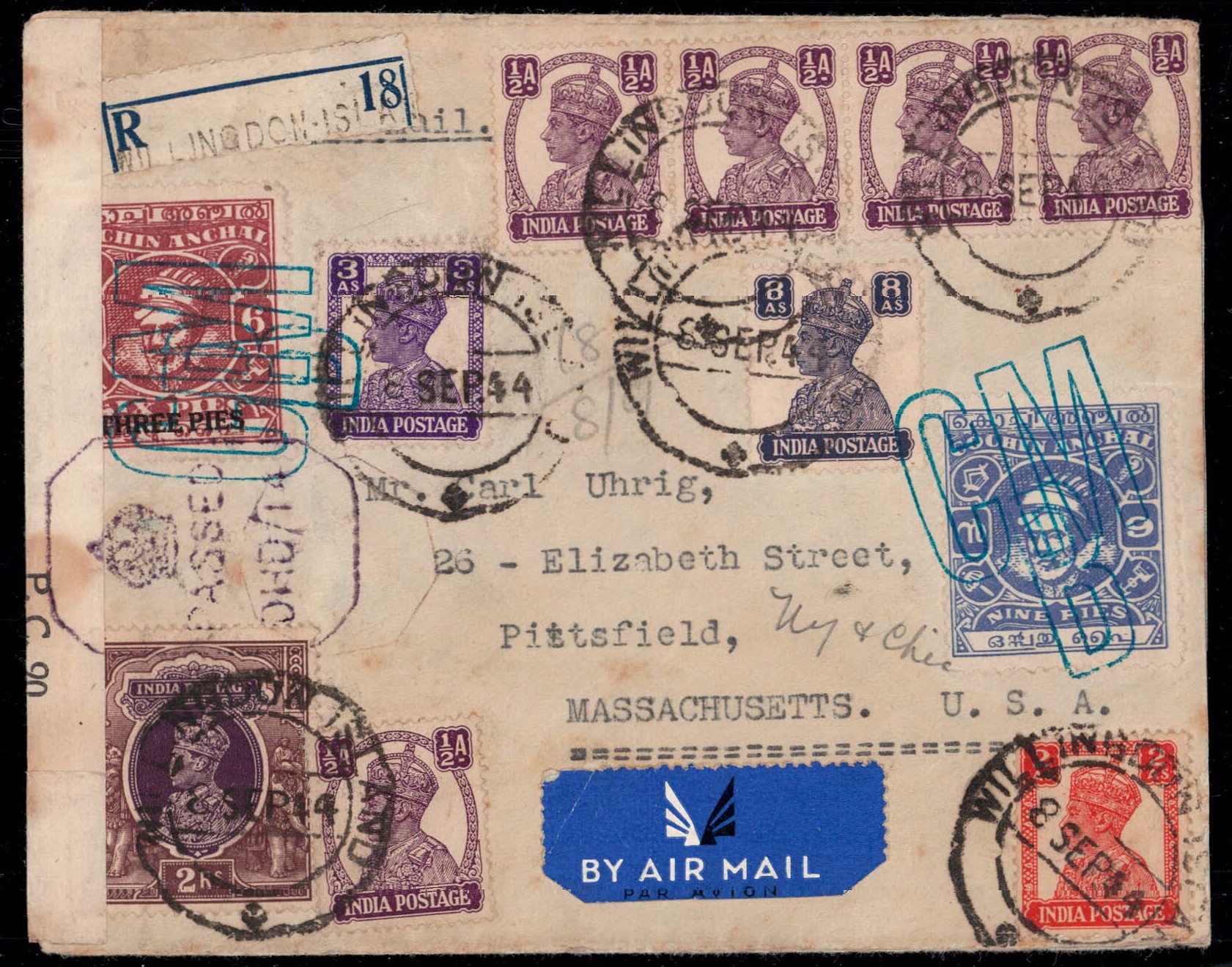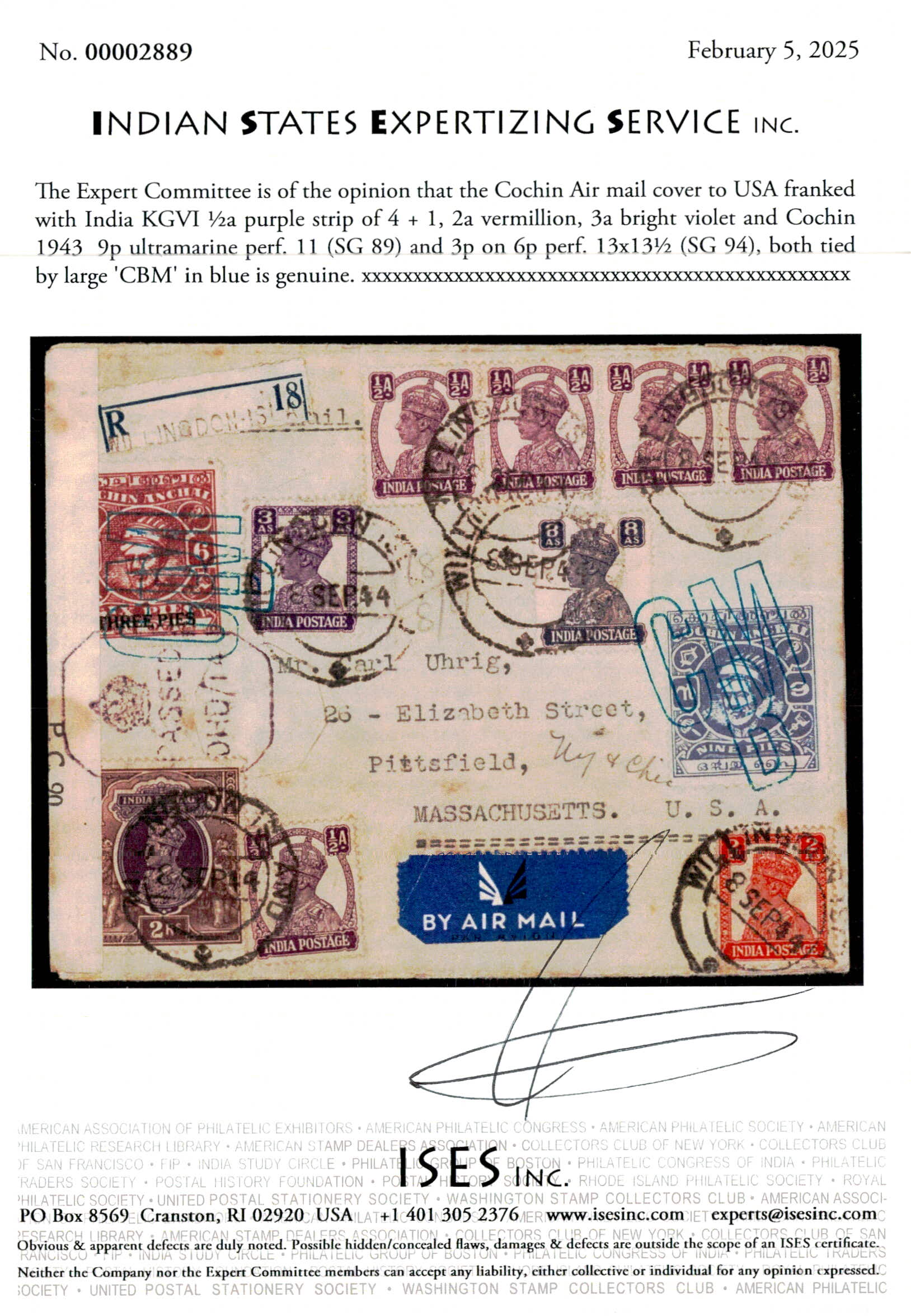 Air mail cover from Cochin to USA franked with India KGVI ½a purple strip of 4 + 1, 2a vermillion, 3a bright violet all tied by "WILLINGDON ISLAND / 8 SEP 44" cds additionally franked with Cochin 1943 9p ultramarine perf. 11 and 3p on 6p perf. 13x13½ both tied by large 'CBM' in blue with censor label with Miami transit cds and 'PITTSFIELD, MASS / REGISTERED / OCT 18 1944" delivery cds in purple. It is suggested that CBM stamps for 'Cochin Mail Bag' or 'Cochin Maritime Board'. This is the first example of e CBM cancel we have seen in 40 years. 2025 ISES certificate.