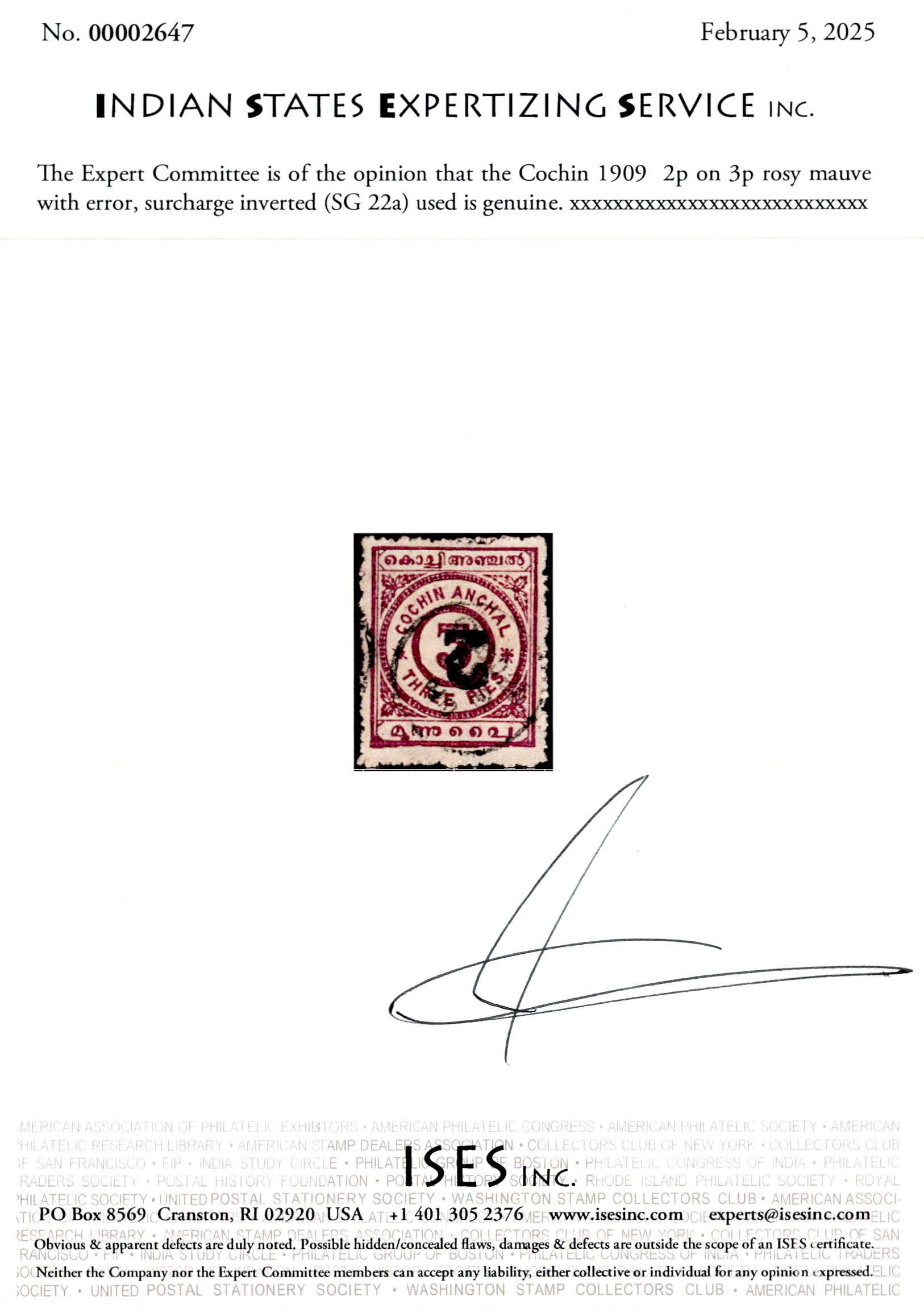 1909 2p on 3p rosy mauve with error, surcharge inverted. 2025 ISES certificate.
