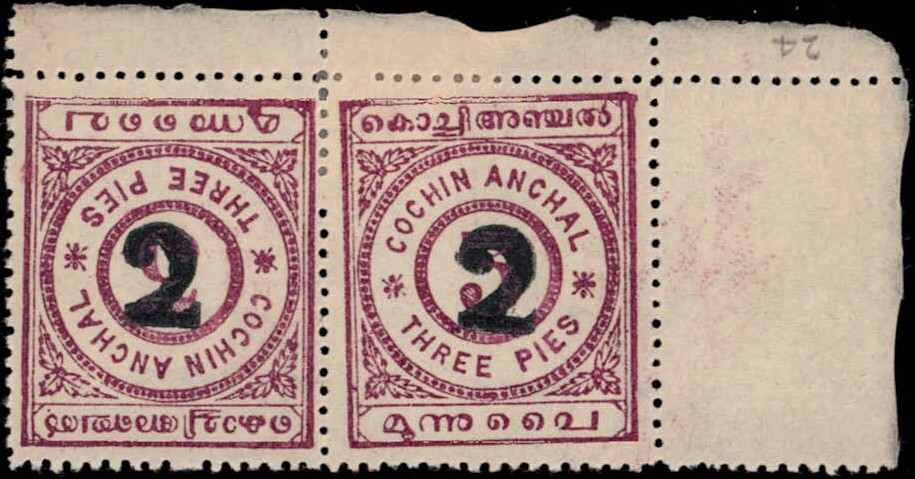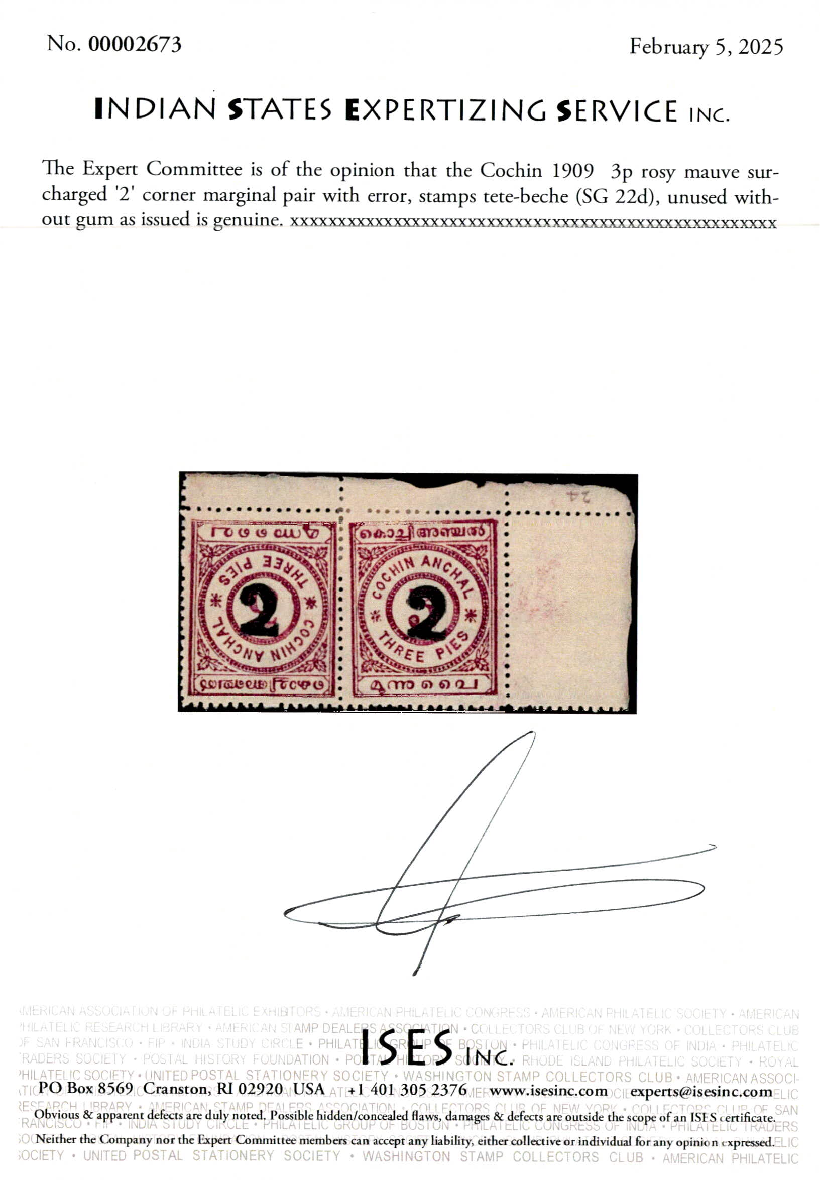 1909 3p rosy mauve surcharged '2' corner marginal pair with error, stamps tete-beche. Unused without gum as issued. 2025 ISES certificate.