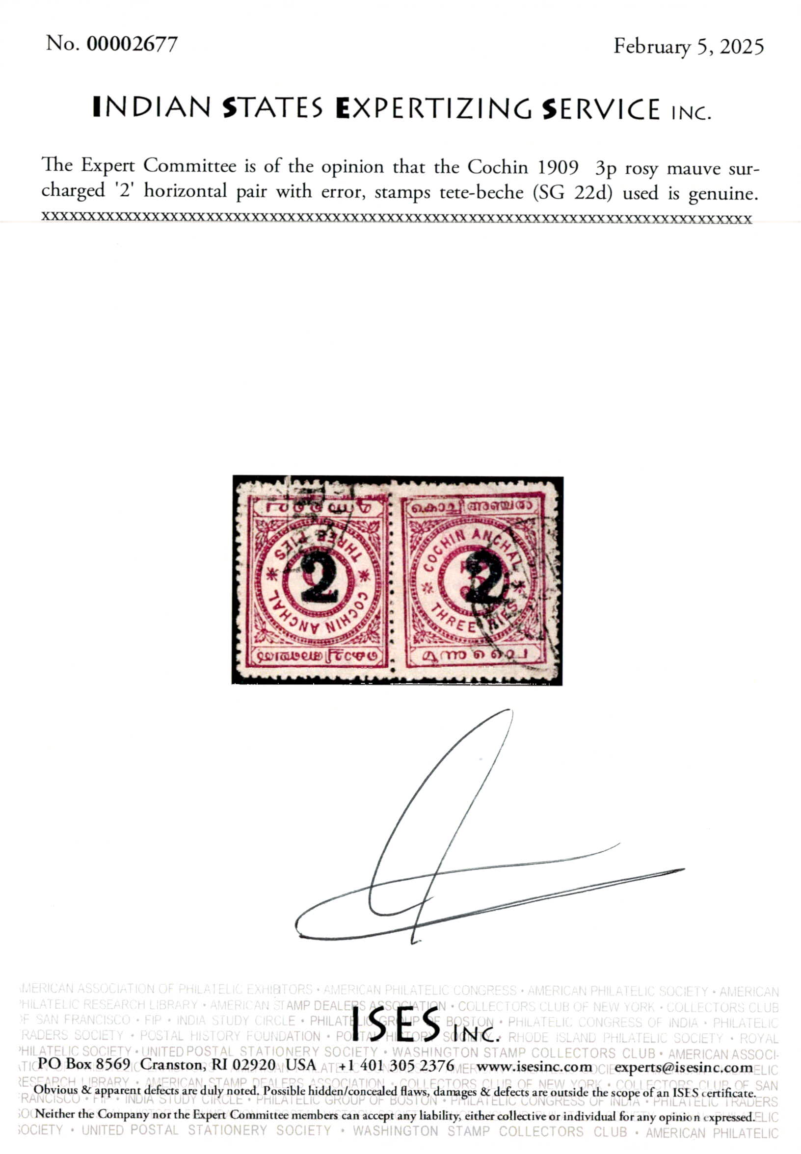 1909 3p rosy mauve surcharged '2' horizontal pair with error, stamps tete-beche. 2025 ISES certificate.