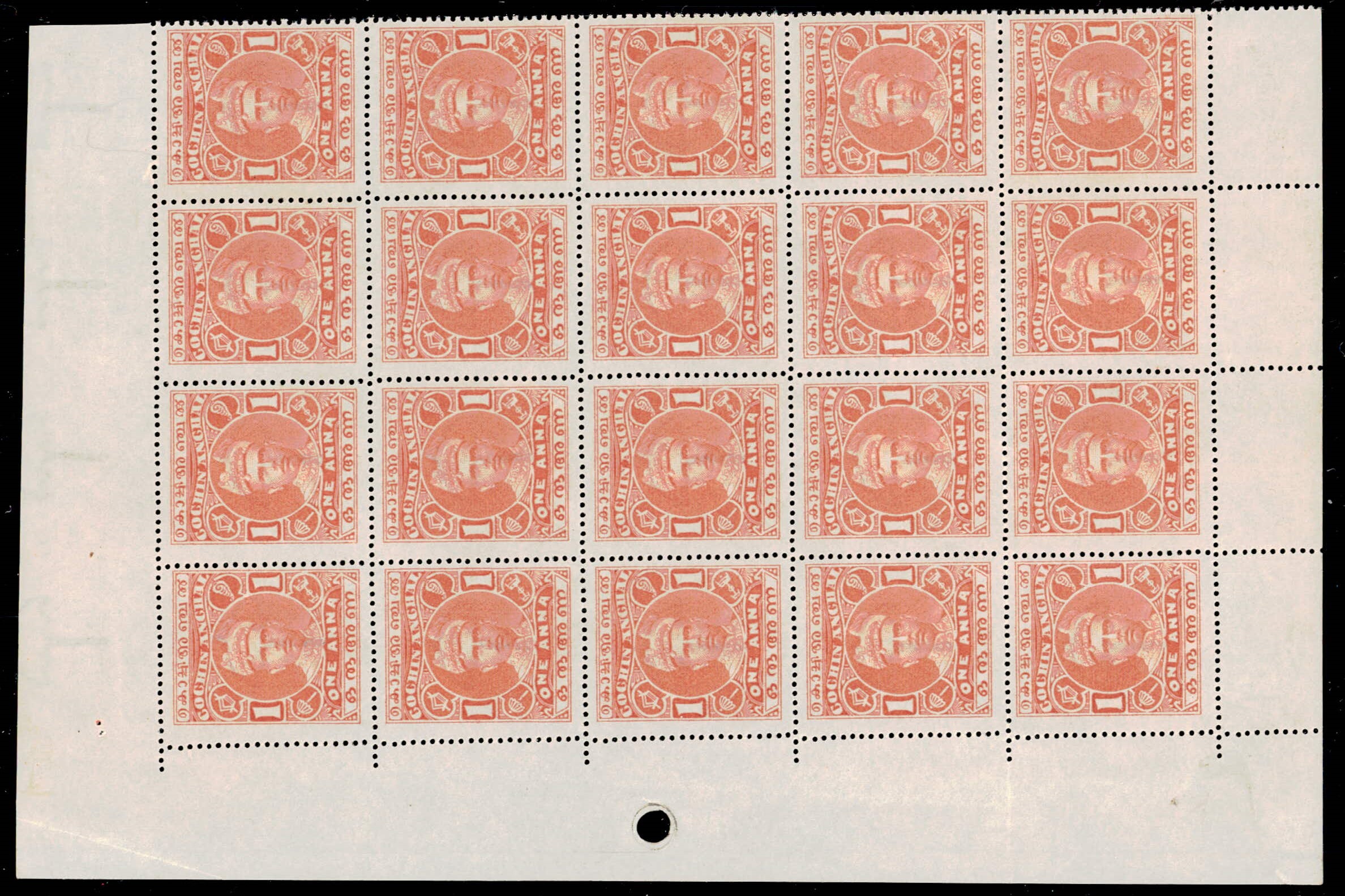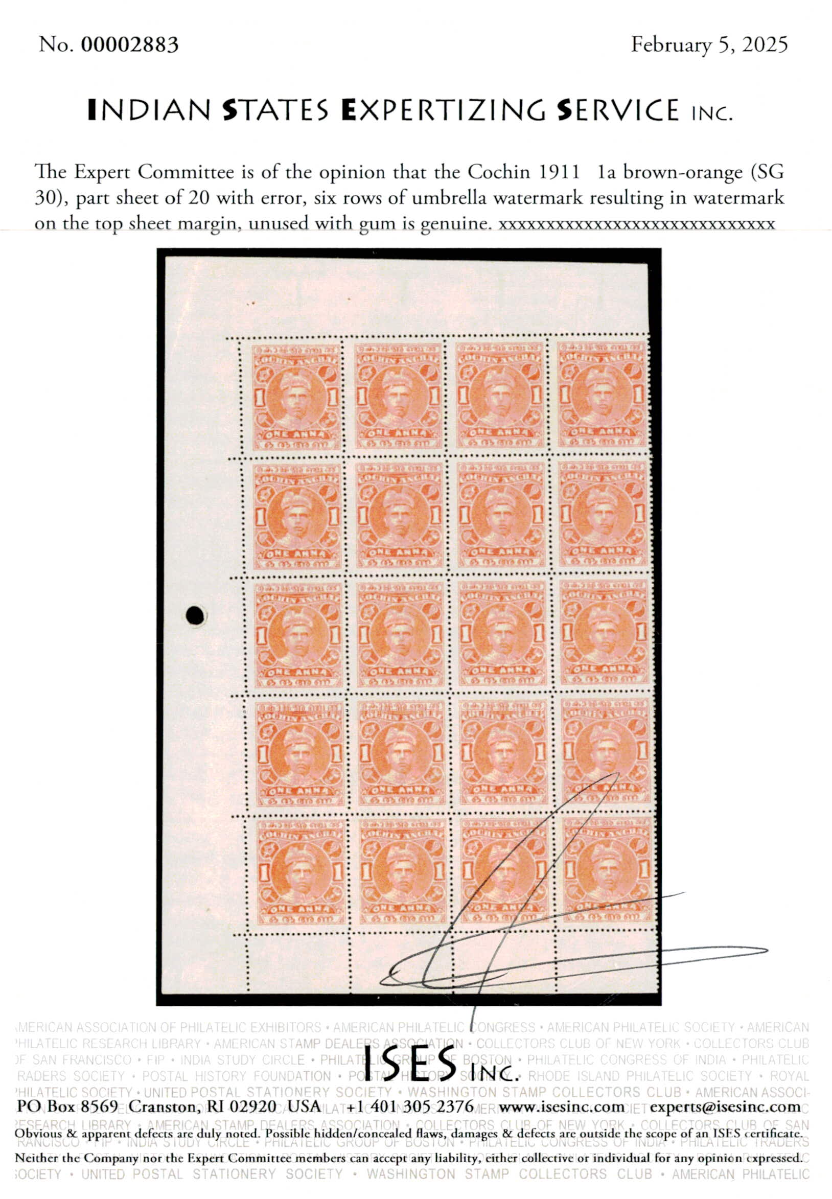 1911 1a brown-orange part sheet of 20 with error, six rows of umbrella watermark resulting in watermark on the top sheet margin.