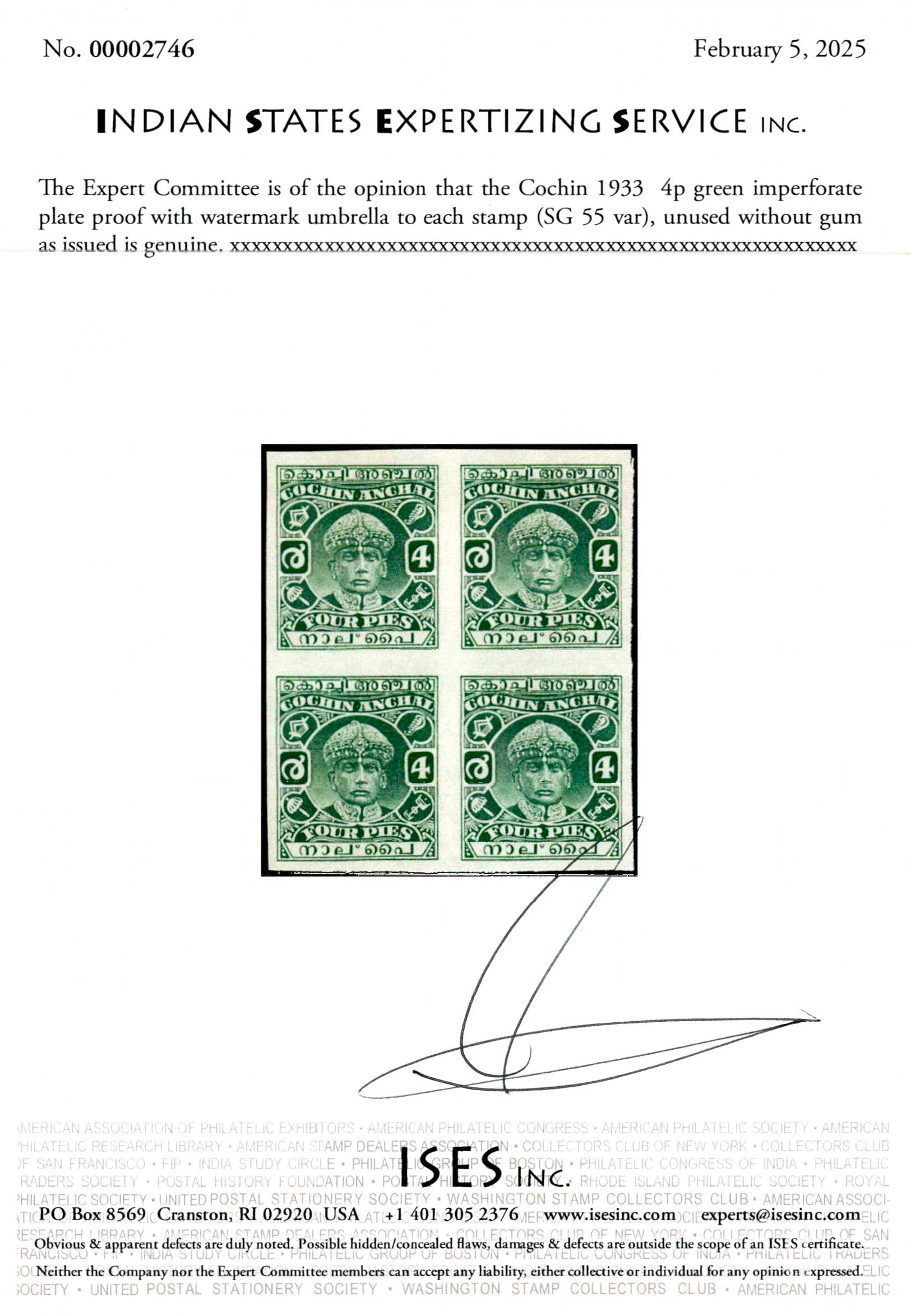 1933 4p green imperforate plate proof with watermark umbrella to each stamp. Unused without gum as issued. 2025 ISES certificate.