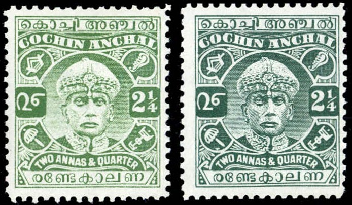 1938 Color Trial of the 2¼a printed in the color of 4p with a normal example on the left for comparison.