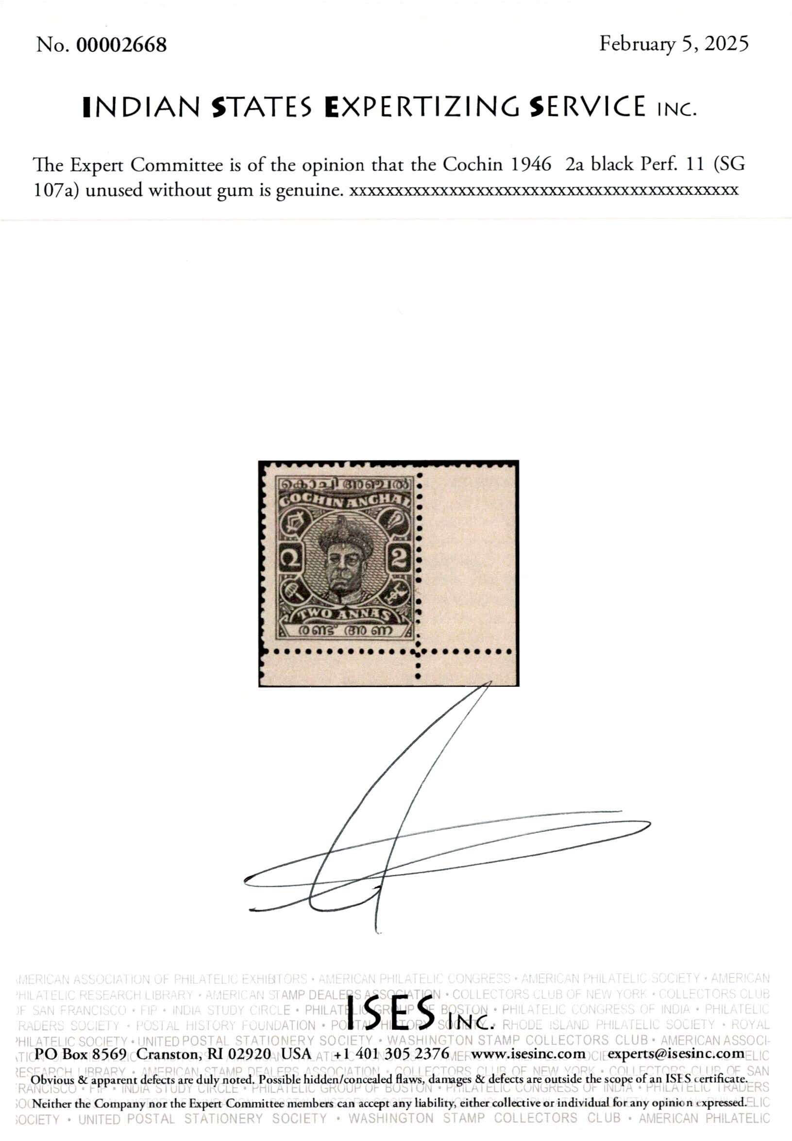 1946 2a black Perf. 11, corner marginal copy. 2025 ISES certificate.