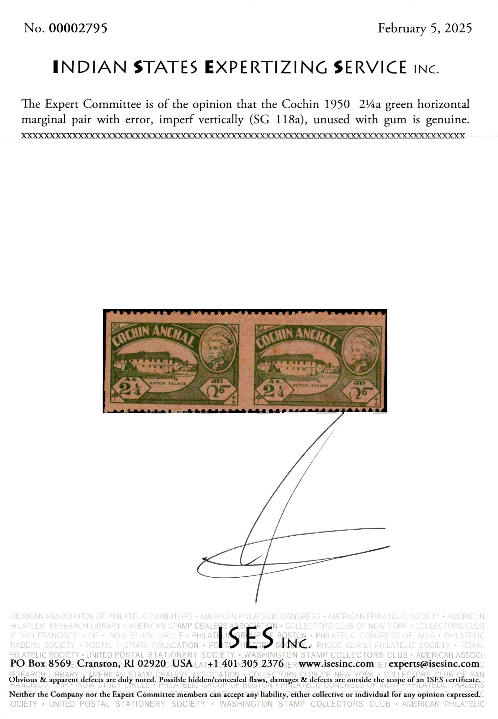 1950 2¼a green horizontal marginal pair with error, imperf vertically. Heavily toned. 2025 ISES certificate