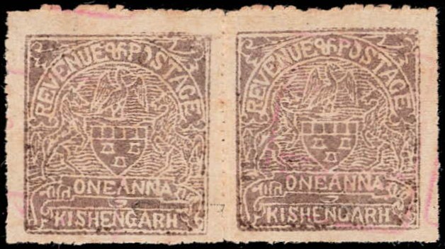 1948-49 Kishangarh 1a brown-lilac pin-perf overprinted RAJASTHAN in red, horizontal pair. Unused without gum as issued with some toning.