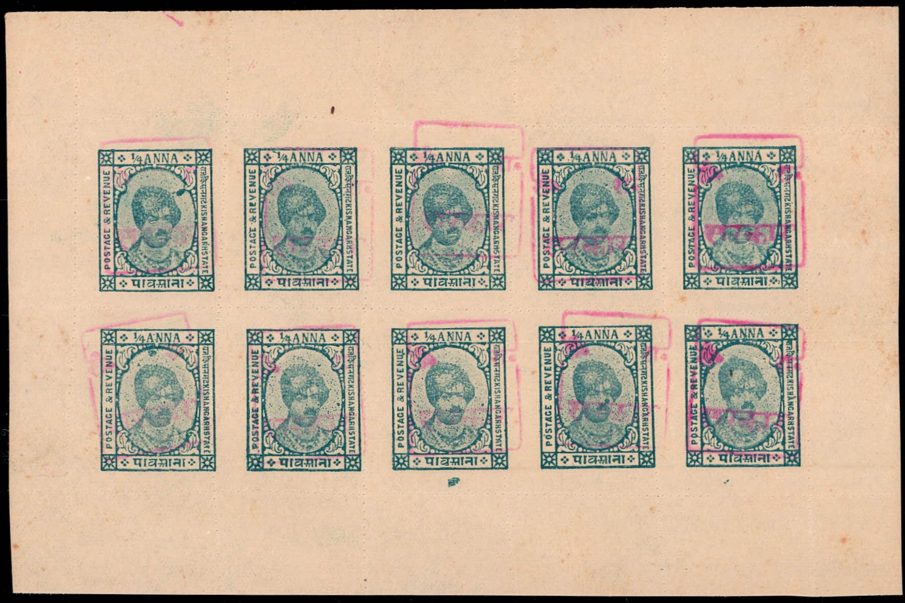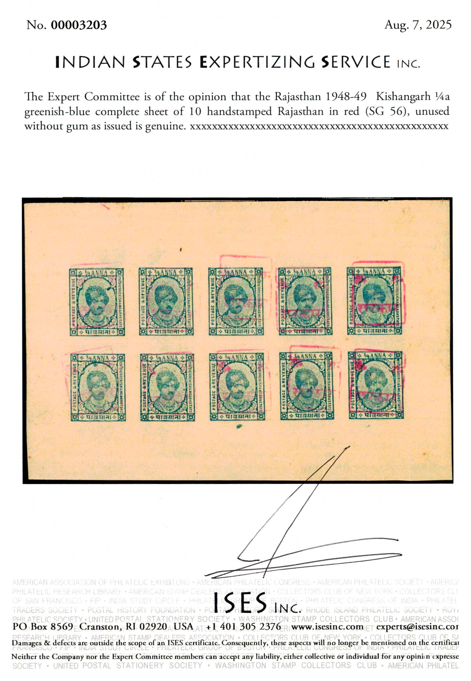 1948-49 Kishangarh ¼a greenish-blue complete sheet of 10 handstamped RAJASTHAN in red. A spectacular complete sheet. Catalog value as singles £900. Unused without gum as issued. 2025 ISES certificate