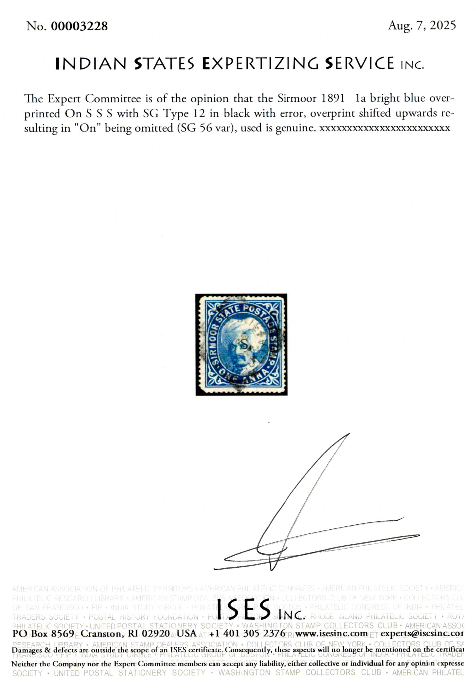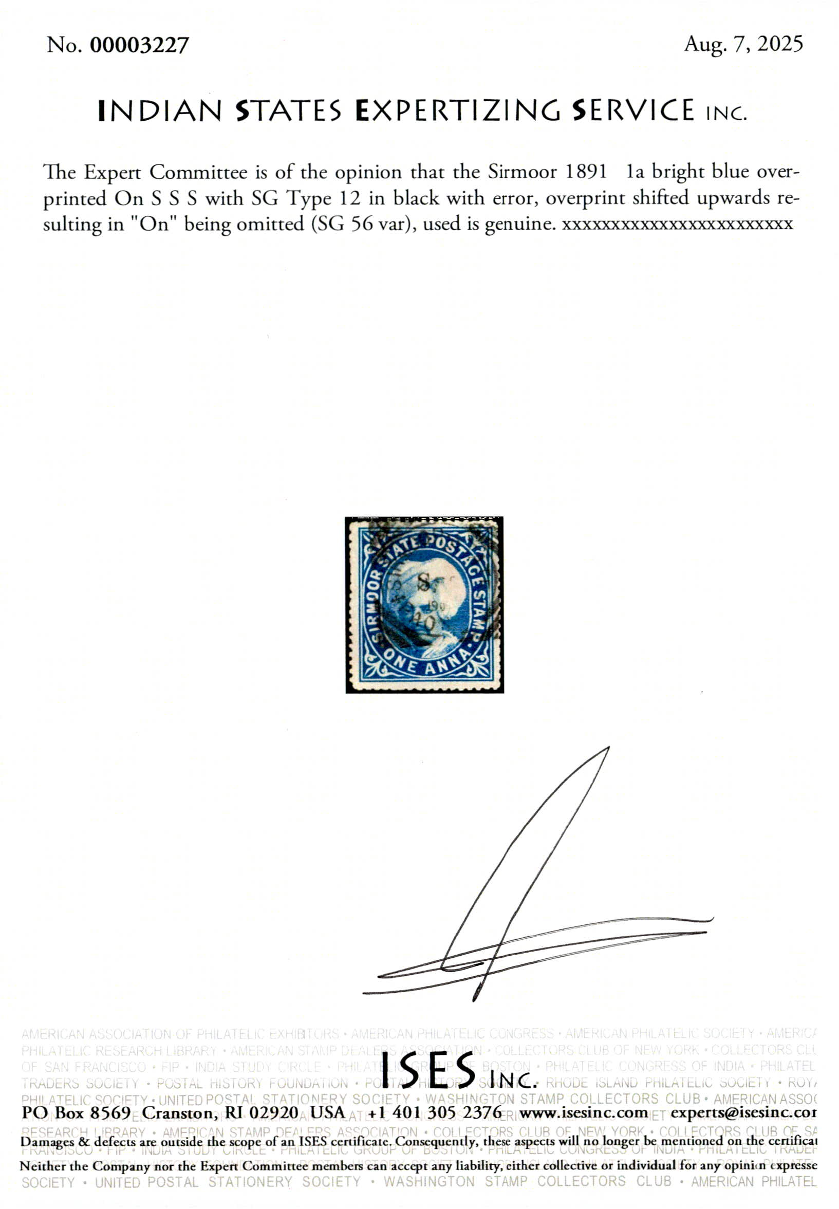 1891 1a bright blue overprinted On S S S with SG type 12 in black with error, dramatic shifting of the overprint resulting in the absence of "On". Catalog value for normal stamp is £700. 2025 ISES certificate