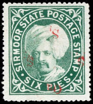1892-97 6p green with double On S S S overprint in red, once with Type 12 and once with Type 13. While this stamp is known in vertical se-tenant pair with Type 12 & 13 overprint, this is the first example we can seen with both Types of overprint on the same stamp. A spectacular rarity of Sirmoor. 2025 ISES certificate.