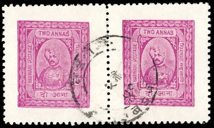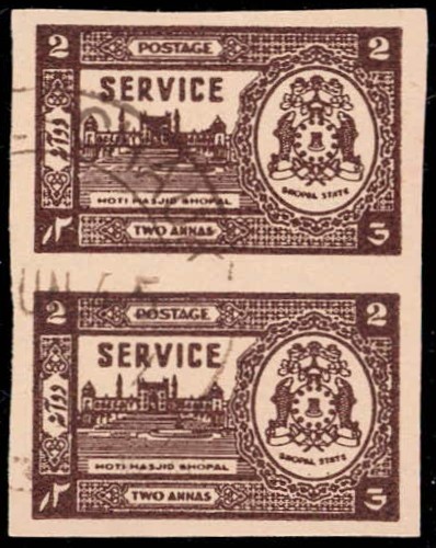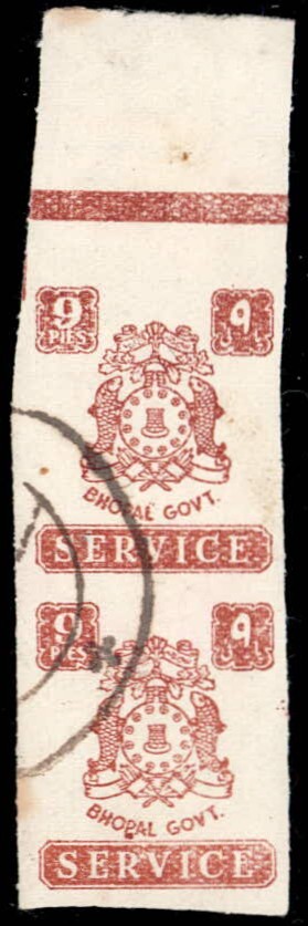 1945 9 pies chestnut marginal vertical pair with error, stamps imperforate