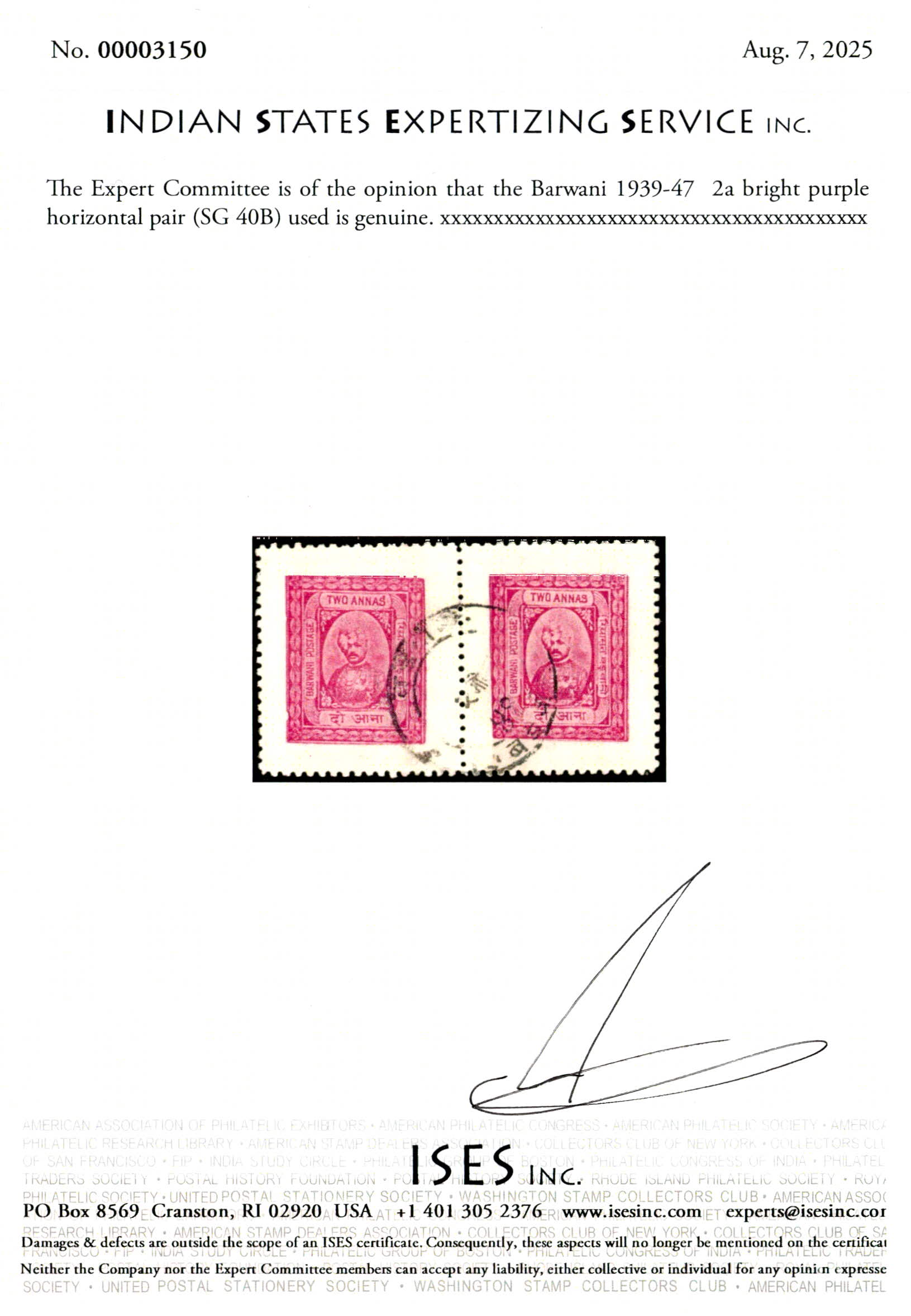 1939-47 2a bright purple horizontal pair. 2025 ISES certificate.