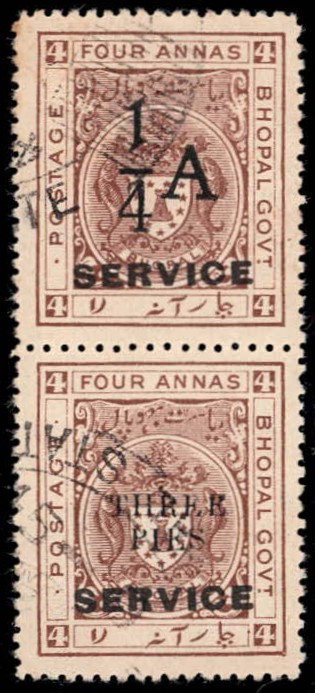 1935-36 4a chocolate vertical se-tenant pair surcharged 1/4 A on top stamp and THREE PIES in black on bottom stamp overprinted SERVICE.