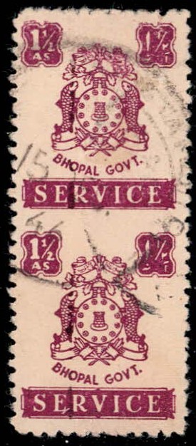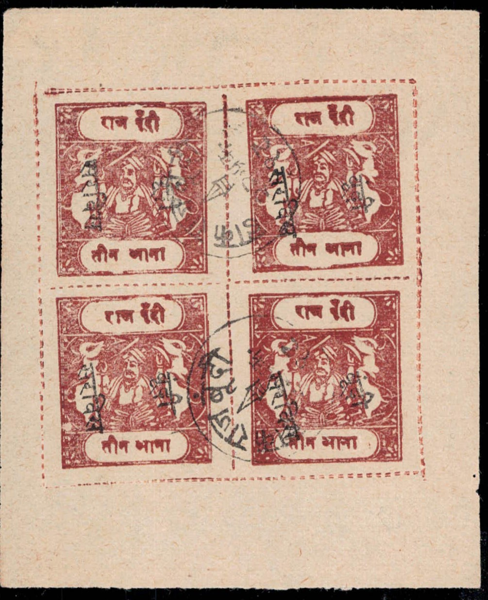 1915-41 3a chestnut complete sheet of four overprinted Bundi Service in Devanagri sideways. Stamps cancelled to order and very scarce as such.