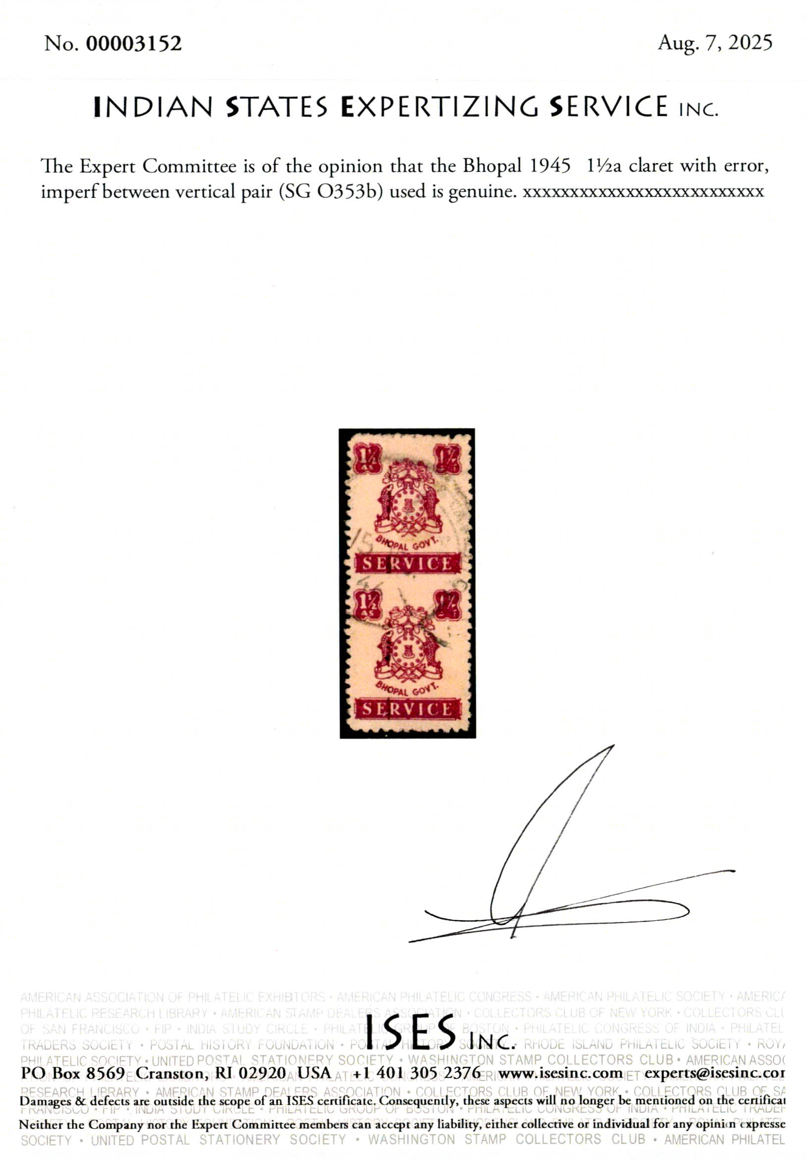 1945 1½a claret with error, imperf between vertical pair. 2025 ISES certificate