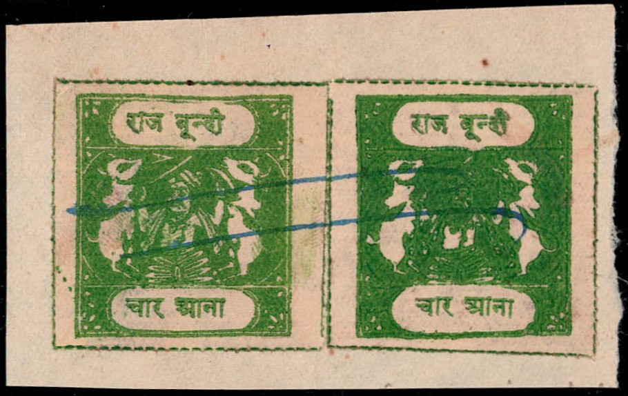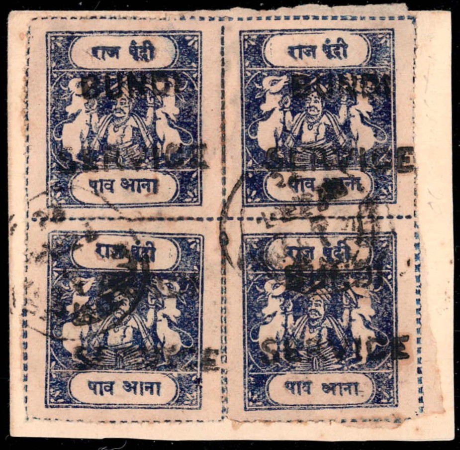 1915-41 ¼a ultramarine block of four overprinted BUNDI SERVICE in large English letters affixed to piece of cover with multiple strikes of the Bundi cds with Dak Raj Bundi / 18 June / 19" delivery cds on reverse. Used Official sacred cows stamps are rare and unpriced in SG.