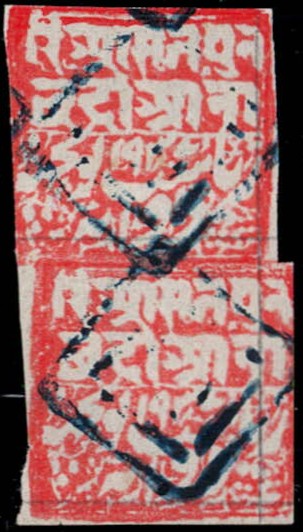 1885-94 2a red on lavender wove paper, vertical pair cancelled by concentric of 3 squared in blue ink and rare as such.