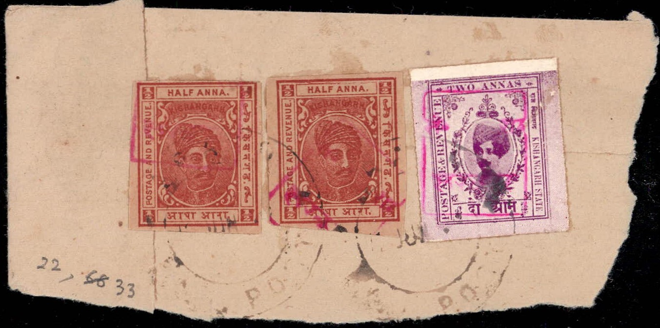 1949 Kishangarh ½a postal stationery envelope cut-outs x 2 and 1912-16 2a purple all handstamped with RAJASTHAN in red used on piece. Kishangarh envelopes were printed on very brittle paper, unsuitable for mailing, and were cut up and used as stamps.