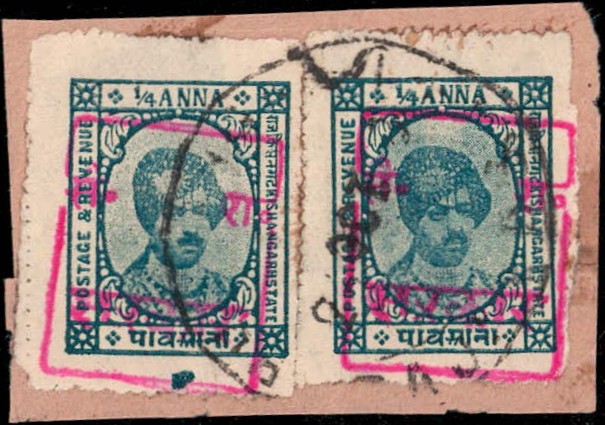 1949 Kishangarh ¼a greenish-blue x 2 single copies with RAJASTHAN handstamp in red used on piece.
