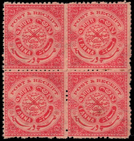 1898 ½a orange-brown block of four surcharged ¼a with error, surcharge inverted. Toned gum as usually found with this issue. Top two stamps hinged, bottom two stamps never-hinged. 2025 ISES certificate.
