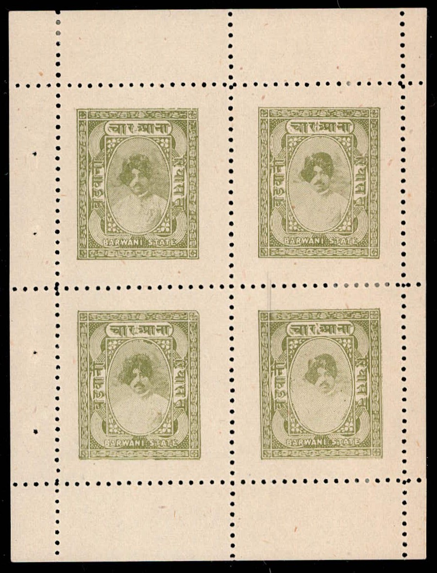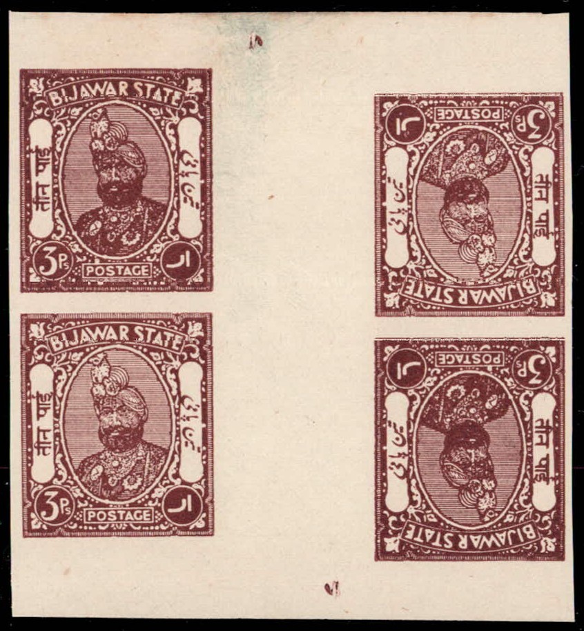 1935 3p brown imperforate block of four with error, stamps printed upside down in relationship to each other resulting in two imperf horizontal tete-beche pairs, not listed in SG. Minute staining.
