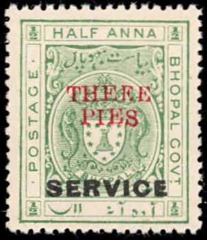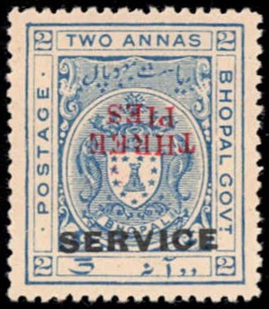 1935-36 2a ultramarine overprinted SERVICE surcharged THREE PIES in red with error, overprint inverted.