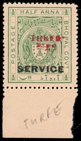 1935-36 ½a yellow-green overprinted SERVICE surcharged THREE PIES in red with error, THRFE instead of THREE