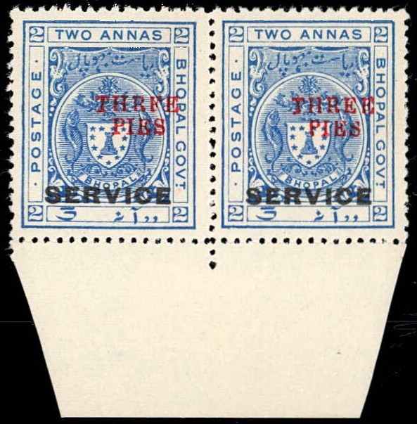 1935-36 2a ultramarine bottom marginal horizontal pair overprinted SERVICE surcharged THREE PIES in red with error, 'THRFE' instead of THREE on left stamp