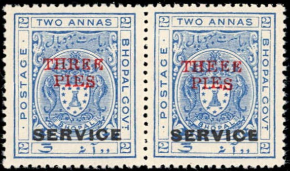 1935-36 2a ultramarine horizontal pair overprinted SERVICE surcharged THREE PIES in red with error, 'THEEE' instead of THREE on right stamp
