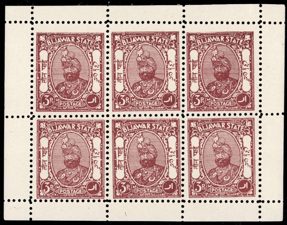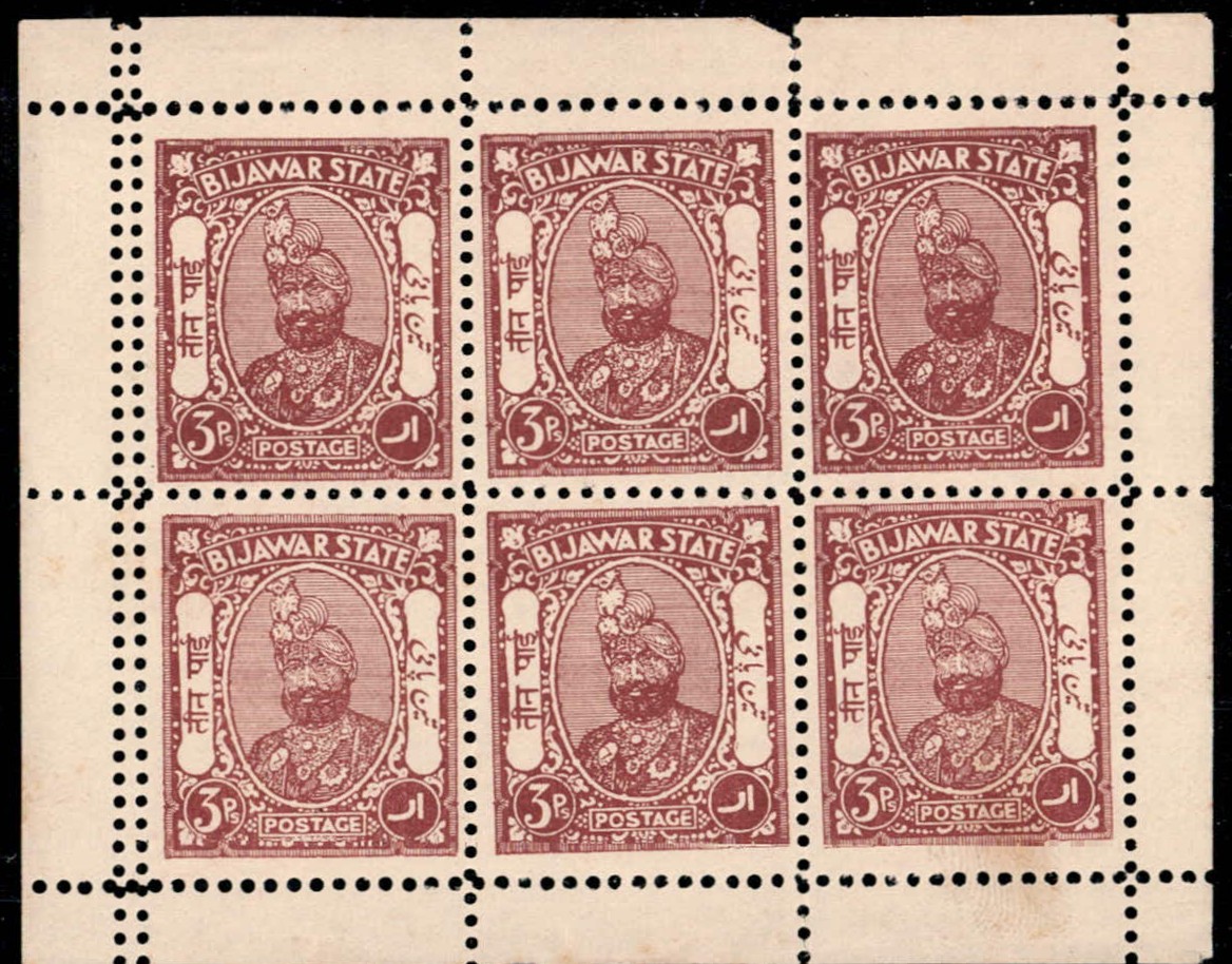 1935-36 3p brown complete sheet of six with error, double vertical perforation on left.