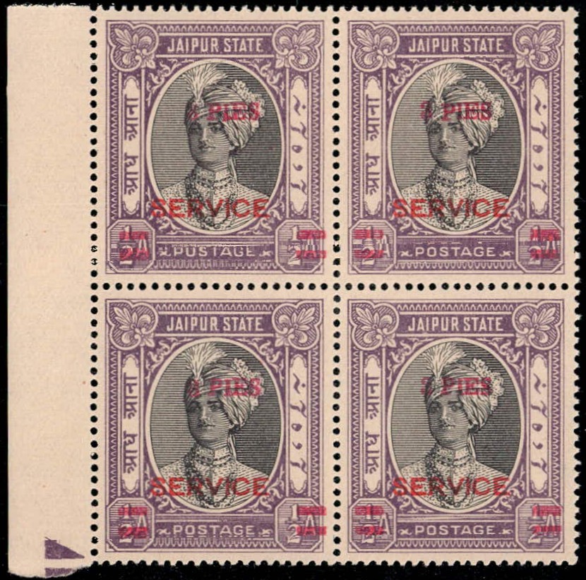 1947 ½a black & violet surcharged 3 PIES in red overprinted SERVICE in red, marginal block of 4