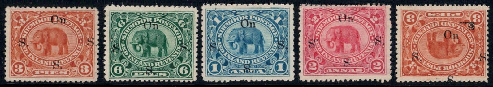 1894-99 3 pies to 2 annas overprinted On S S S along with 3 pies with inverted overprint