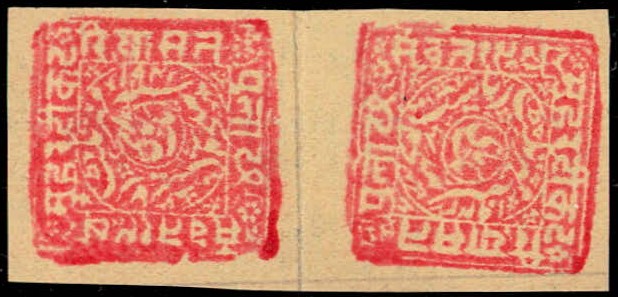1948-49 Kishangarh 1a brown-lilac pin-perf overprinted RAJASTHAN in red, horizontal pair. Unused without gum as issued with some toning.