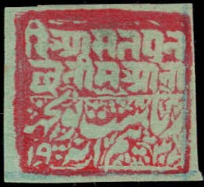 1886 Shortly before the State Postal system was absorbed into the Imperial Post, bi-colored Essays were produced. The Essay's central design is the portrait of the ruler with “RAJPIPLA POSGE” and “1 ANNA” below it. These were never put into production as, shortly after the essays were produced, the State’s general and postal administration was taken over by the Imperial Government. The stamp is lithographed on unwatermarked wove paper perf. 11.5. “SPECIMEN” in green ink is printed diagonally on the back. A detailed article on the Essay by HDS Haverbeck first appeared in the “Philatelic Journal of India” in October 1977. A subsequent article on the Essay by Dan Walker was published in “India Post” Volume 44 page 110-111. A total of either six or eight such Essays exist. 2025 ISES certificate
