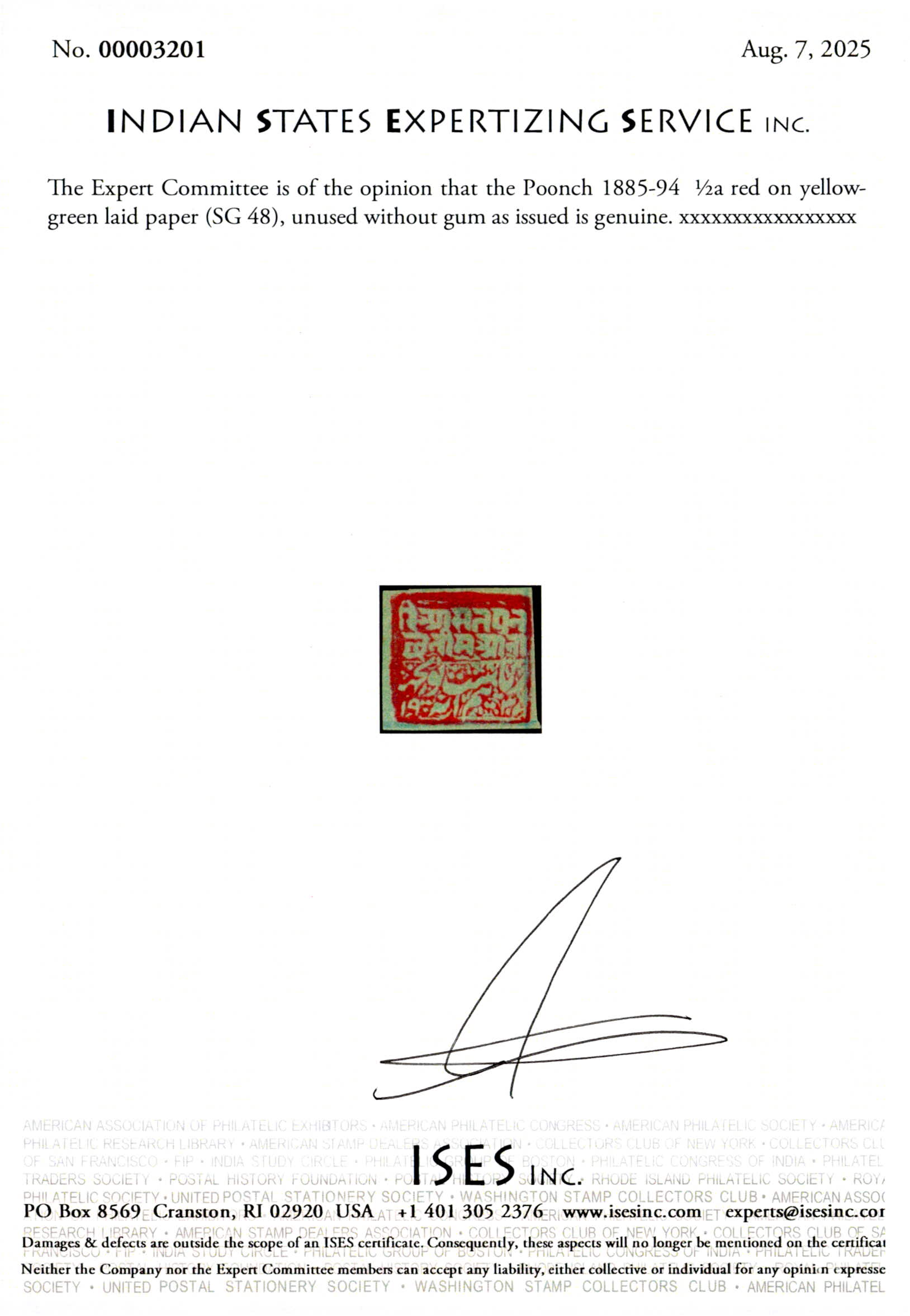 1885-94 ½a red on yellow-green laid paper. Unused without gum as issued. Unpriced as unused in SG, catalog value for used is £1000. 2025 ISES certificate