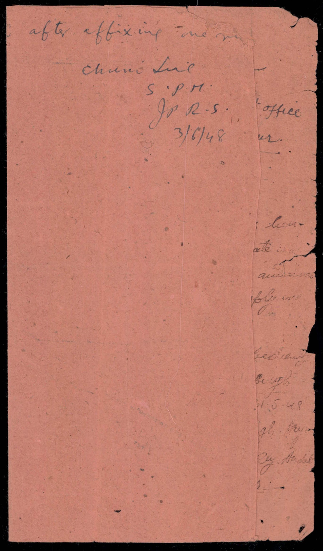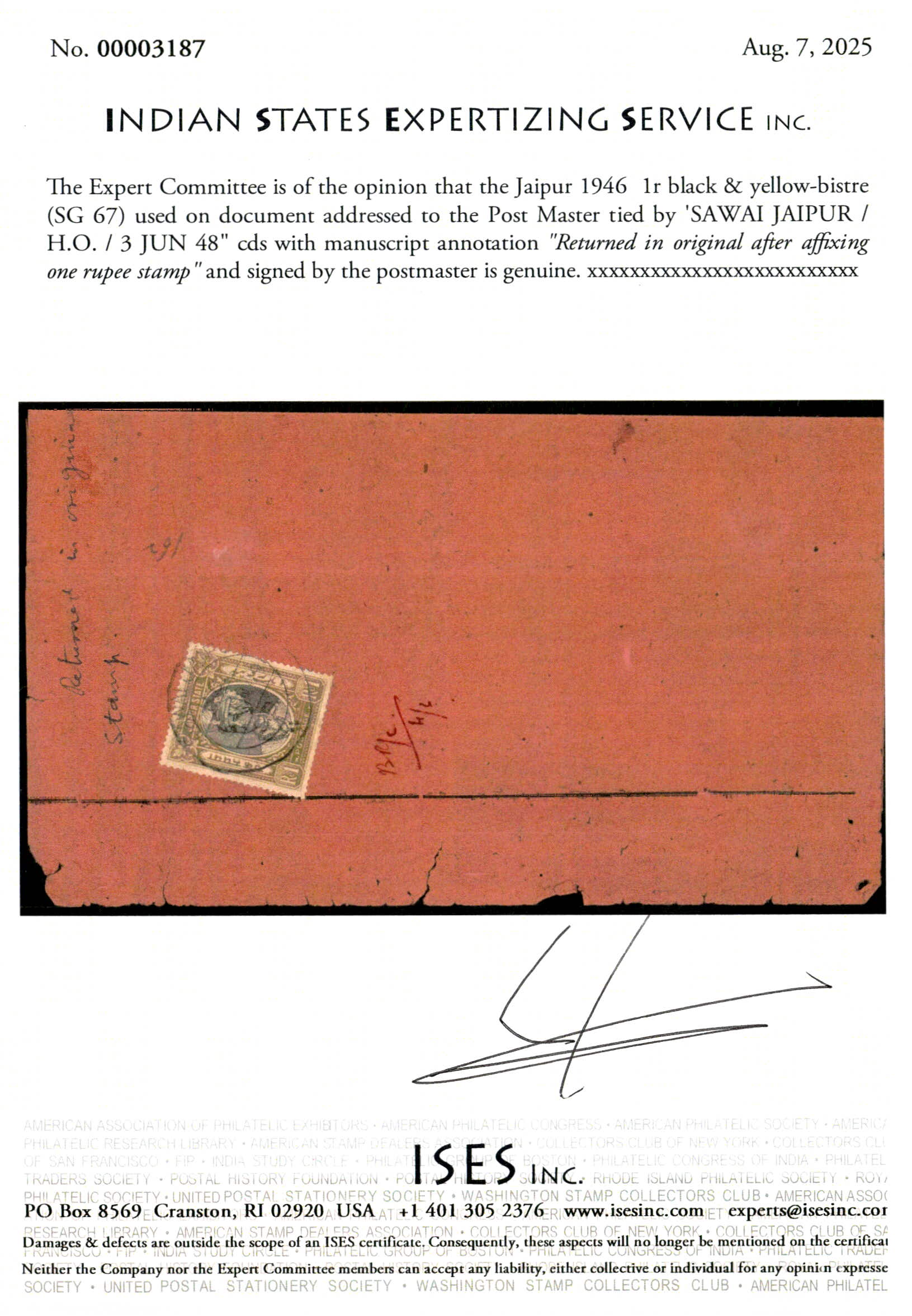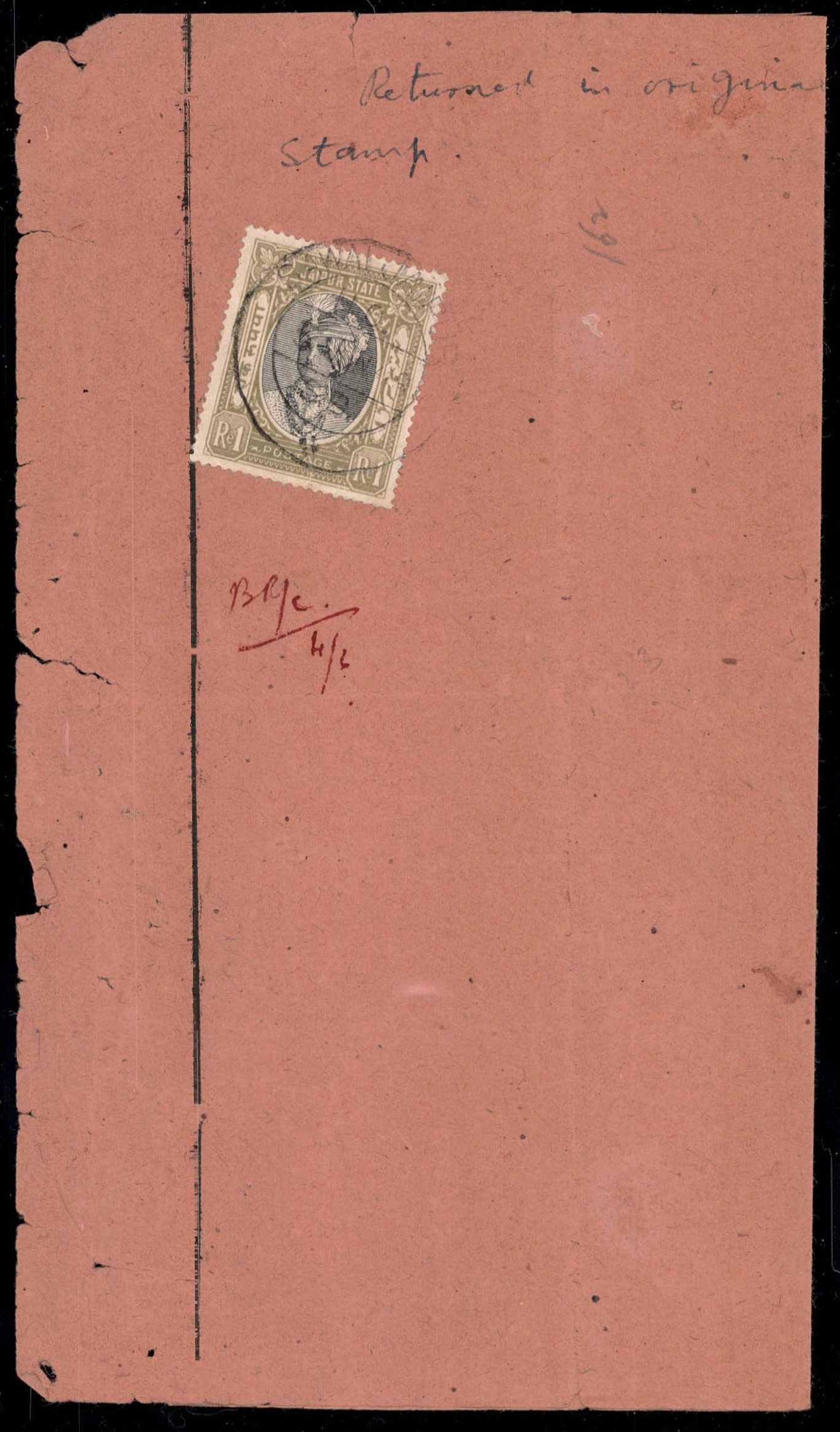 1946 1r black & yellow-bistre used on document addressed to the Post Master tied by 'SAWAI JAIPUR / H.O. / 3 JUN 48" cds with manuscript annotation "Returned in original after affixing one rupee stamp" and signed by the postmaster. A spectacular postal usage of the 1 rupee stamp. 2025m ISES certificate
