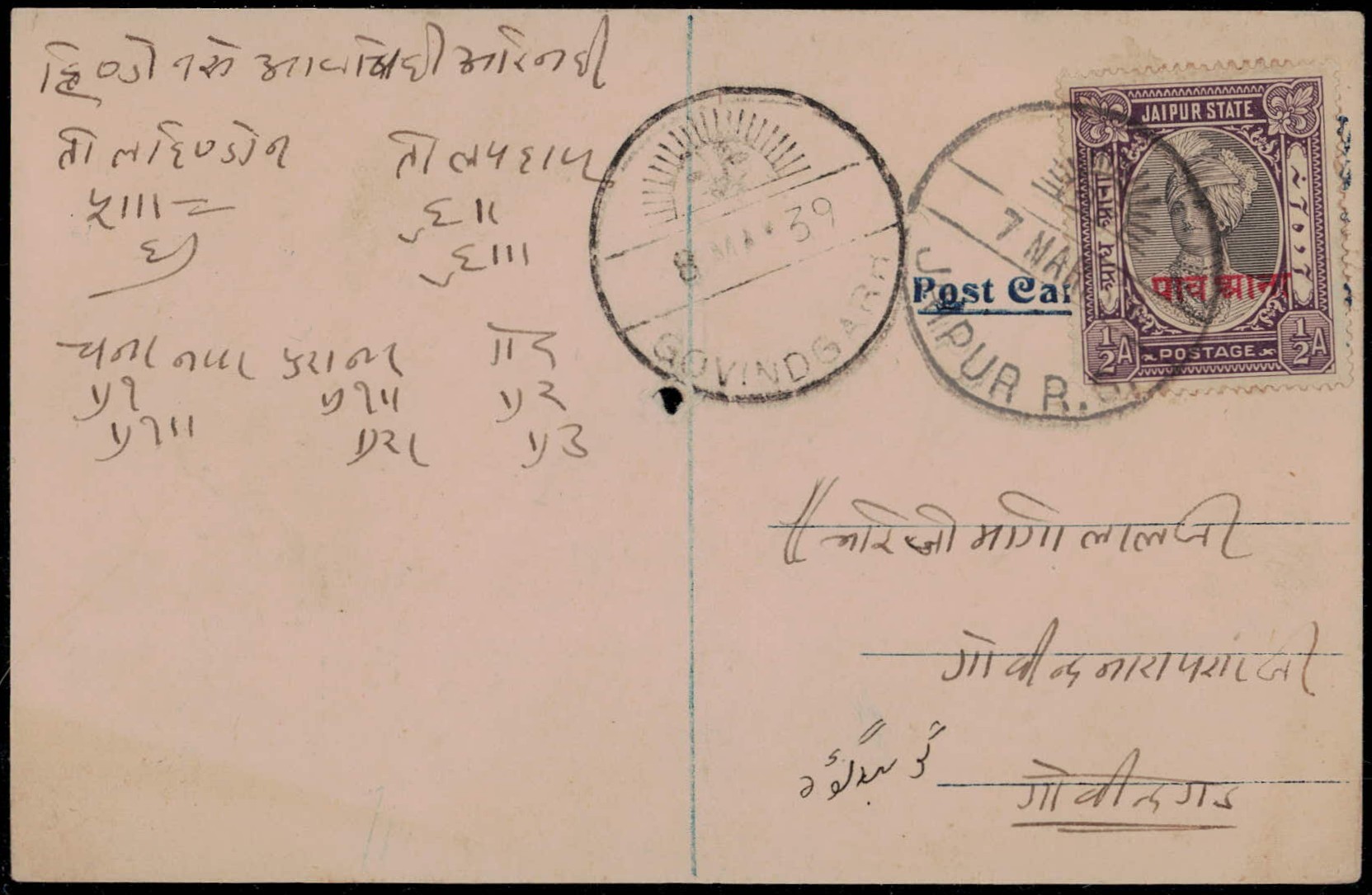 1938 ½a black & violet surcharged PAV ANNA in Devanagri in red used on local postcard tied by Jaipur 7 March 1939 cds.