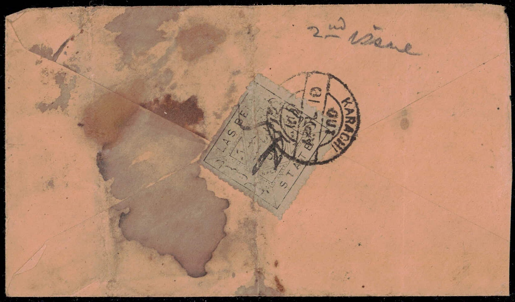 India QV ½a postal stationery envelope additionally franked with Rajpipla 1p blue tied by Rajpipla barred cancel with Nandod native dispatch cds, QV indicium cancelled by "CHANDOD / 20 JUL 84" cds with "BOMBAY S.W. / JUL 21 / 84" cds. This is only of only five recorded combination covers from Rajpipla. 2025 ISES certificate.