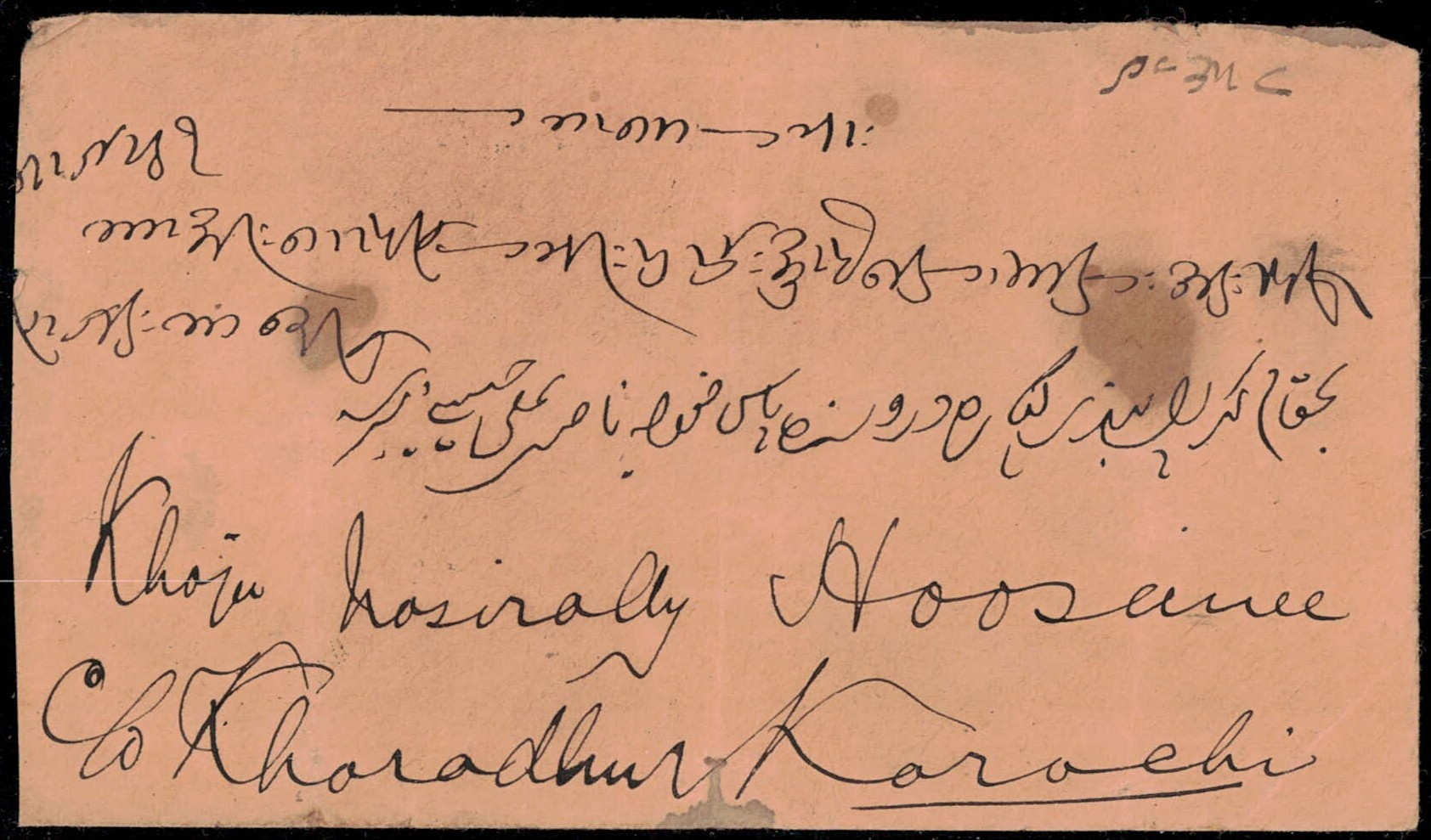 1899 ½a greenish-grey on local cover tied by Karachi cds. Stamp creased from fold and stain on cover