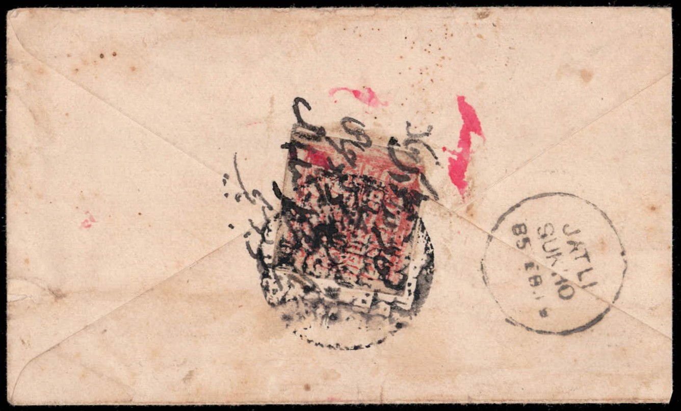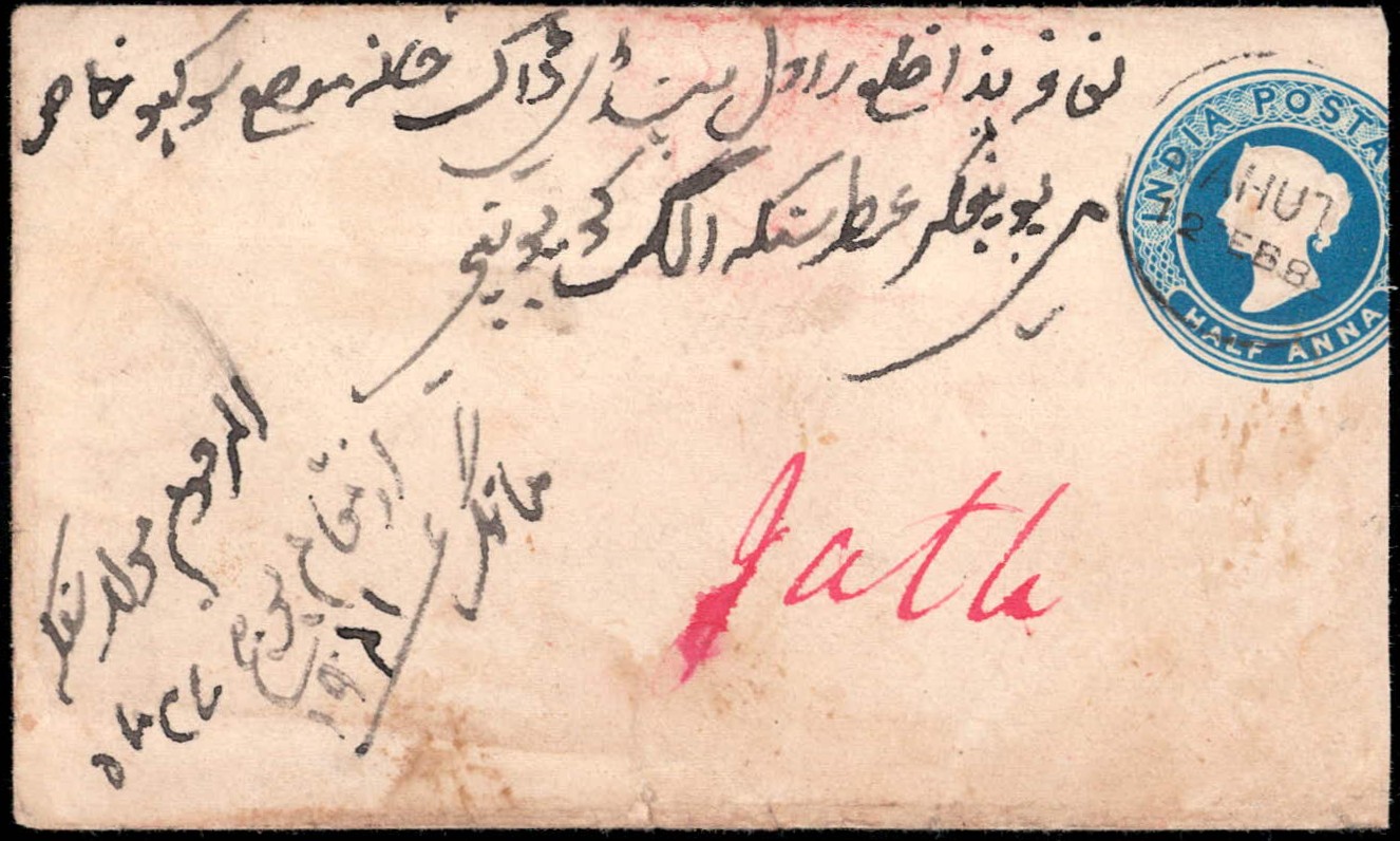 India ½a postal stationery envelope from Pooch to Jatu (British India) additionally franked on reverse with 1883 ½a red on yellowish white wove paper tied by 4 line intaglio seal cancel, indicium cancelled by Kahuta Imperial Exchange post office cancel dated 12 Feb 1885 with Jatu delivery cds dated 18 Feb 1885.