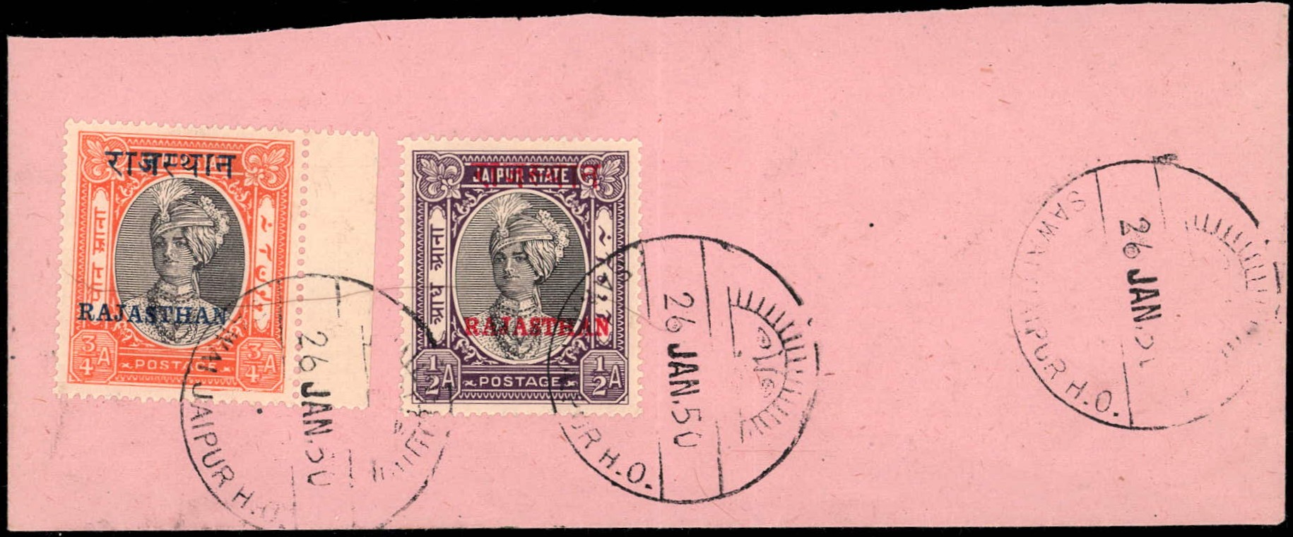 1950 Jaipur ½a and ¾a overprinted RAJASTHAN franked on local part cover both stamps tied by "SAWAI JAIPUR H.O. / 26 JAN 50" cds.