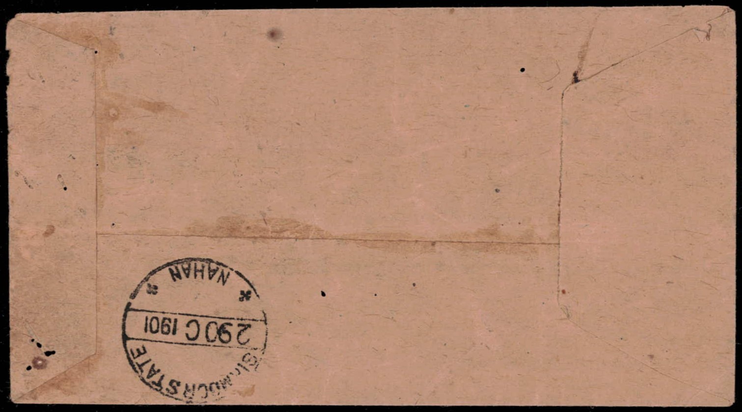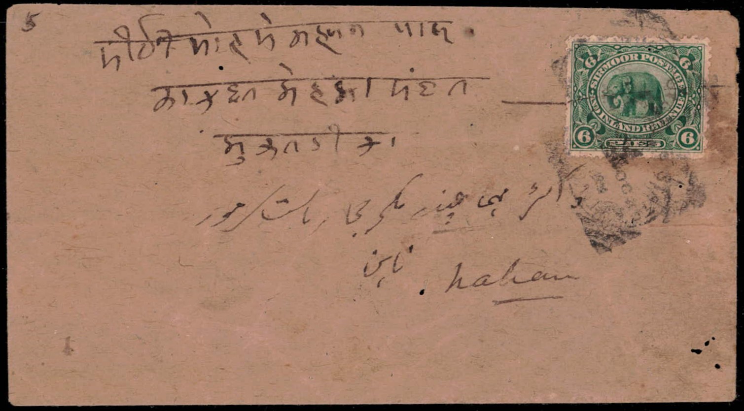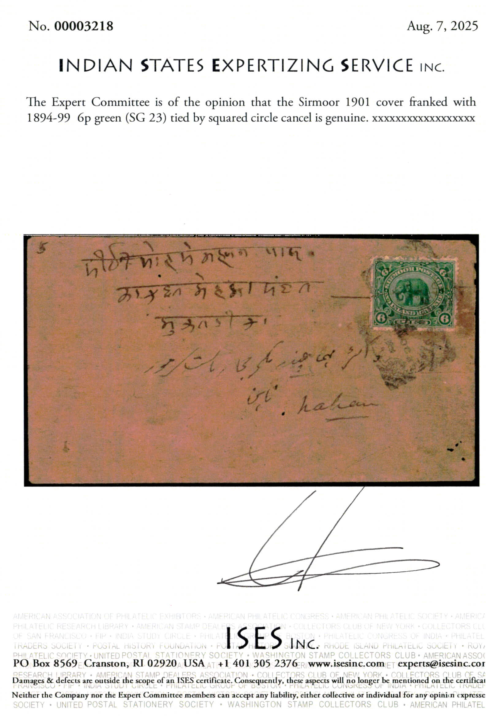 1901 local cover to Nahan franked with 1894-99 6p green tied by squared circle cancel with Nahan delivery cds on reverse. This is one of only three recorded non-philatelic local covers bearing a Sirmoor elephant stamp. Sirmoor stamps on local (within Sirmoor State) mail are virtually non-existent because the Sirmoor postal department had strict orders from the Maharaja of the State to remove all stamps from articles of mail prior to delivery. These used stamps were used to fulfil the demand for Sirmoor used stamps from overseas collectors. 2025 ISES certificate.