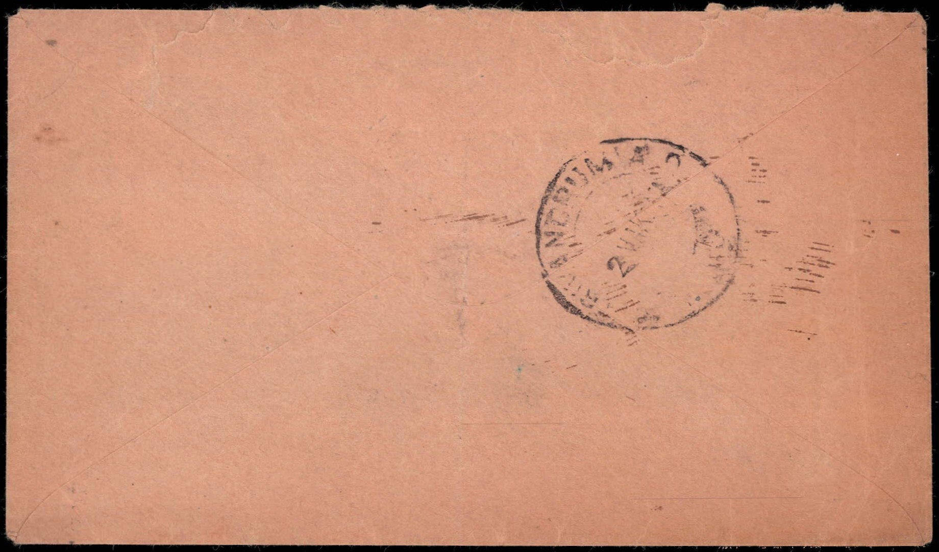 India QV 9p soldiers & Seamen postal stationery envelope additionally franked with Sirmoor 6p green from Sirmoor to Kasauli (British India) with Sirmoor native squared circle cds dated 27 Nov 1894 on reverse, indicium cancelled by Imperial Nahan squared circle cds dated 27 Nov 1894 with Kasauli delivery cds dated 29 November 1894. A spectacular combination cover of Sirmoor being one of only two recoded used in combination with India Soldiers & Seamen postal stationery envelope. 2025 ISES certificate