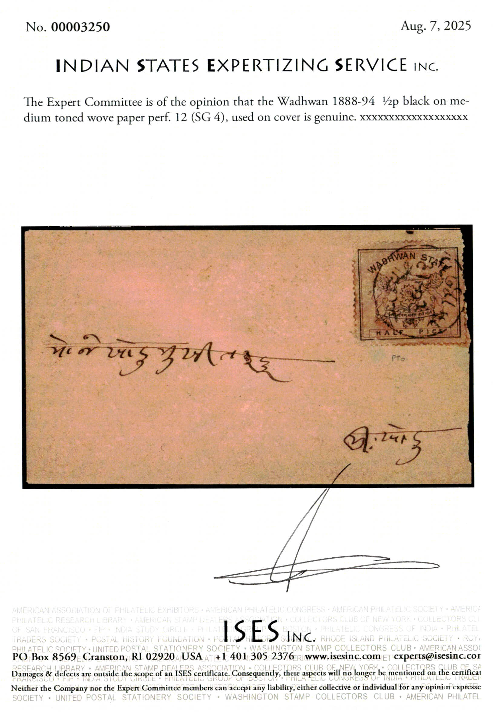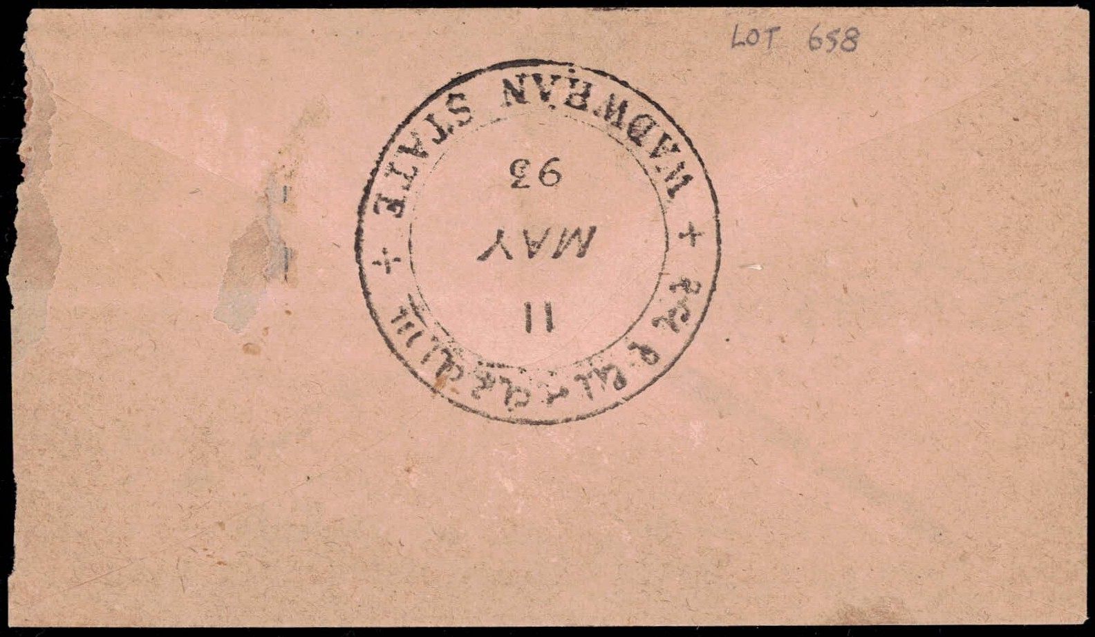 1888-94 ½p black on medium toned wove paper perf. 12 used on local cover tied by native 28mm cds with 45mm 11 MAY 93 cds in black on reverse. Wadhwan covers are rare. 2025 ISES certificate