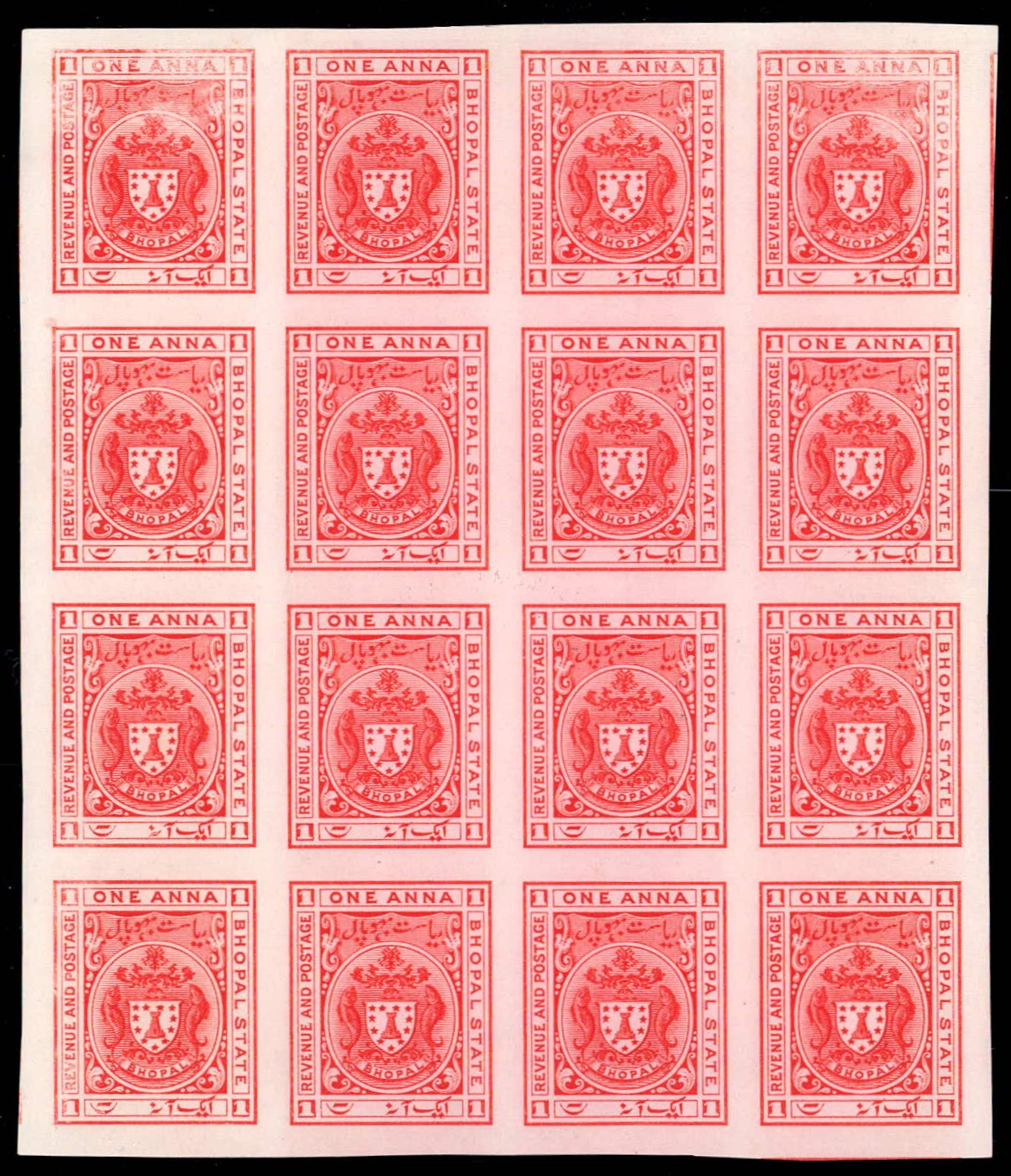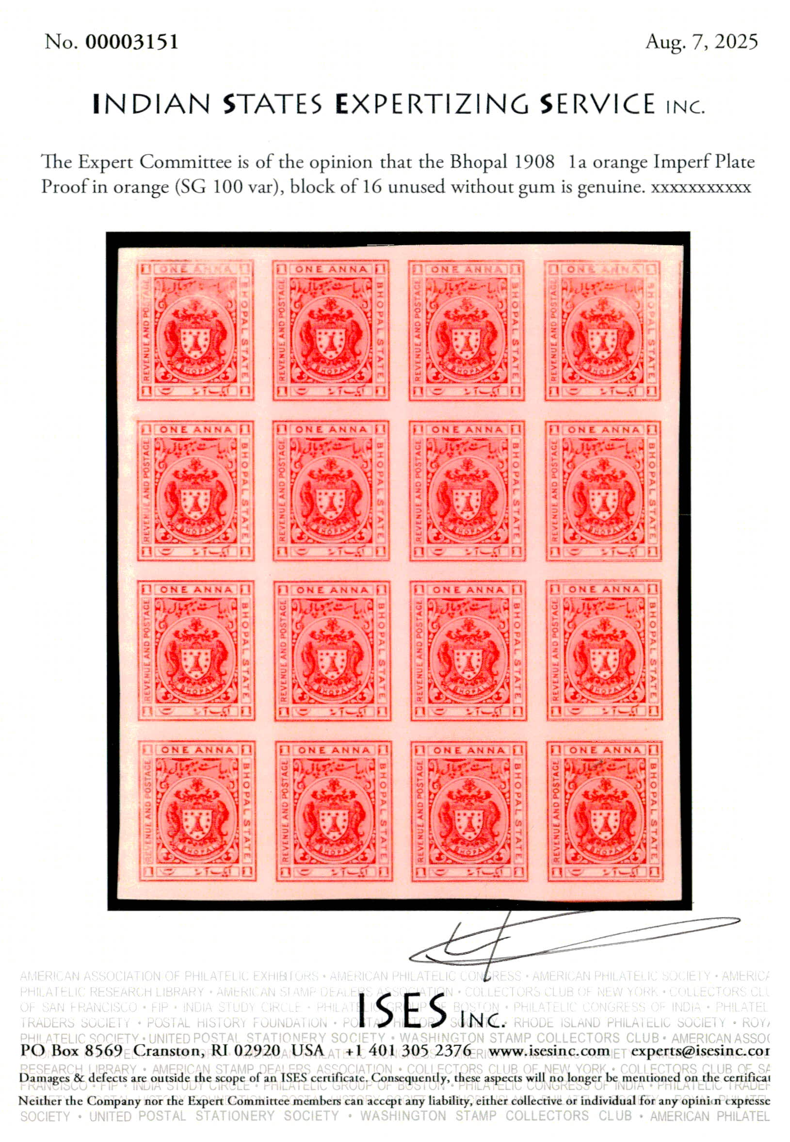 1908 1a orange Imperf Plate Proof in orange, block of 16. 2025 ISES certificate