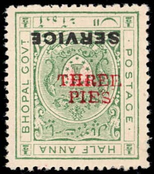 1935-36 ½a yellow-green overprinted SERVICE surcharged THREE PIES in red with error, surcharge inverted.