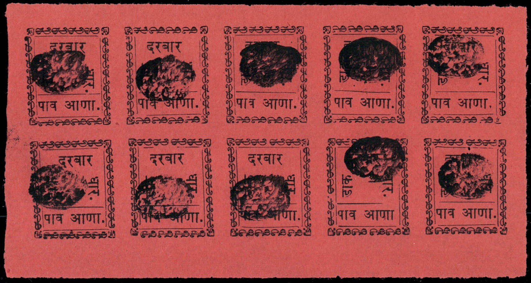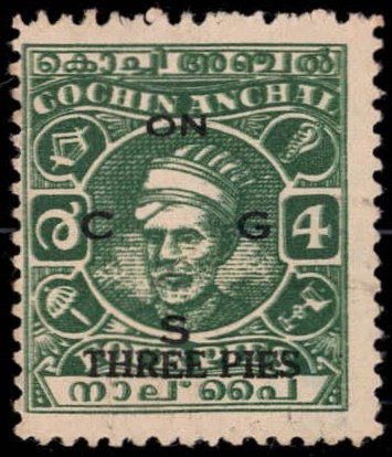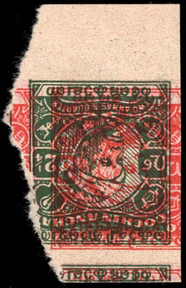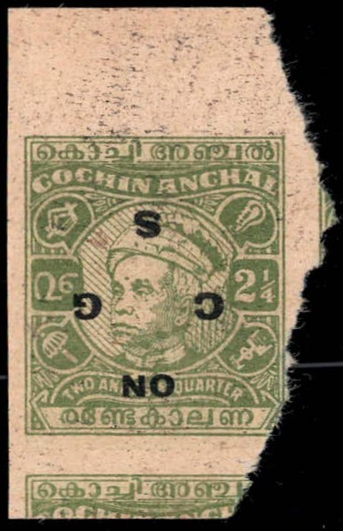 1948-49 2¼a yellow-green Printers waste with ON C G S overprint inverted. The 2¼a stamp is also printed on the reverse but in the color of the 4p with an additional impression of the 3p stamp in carmine.