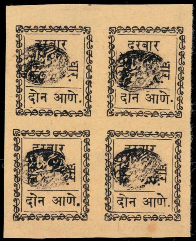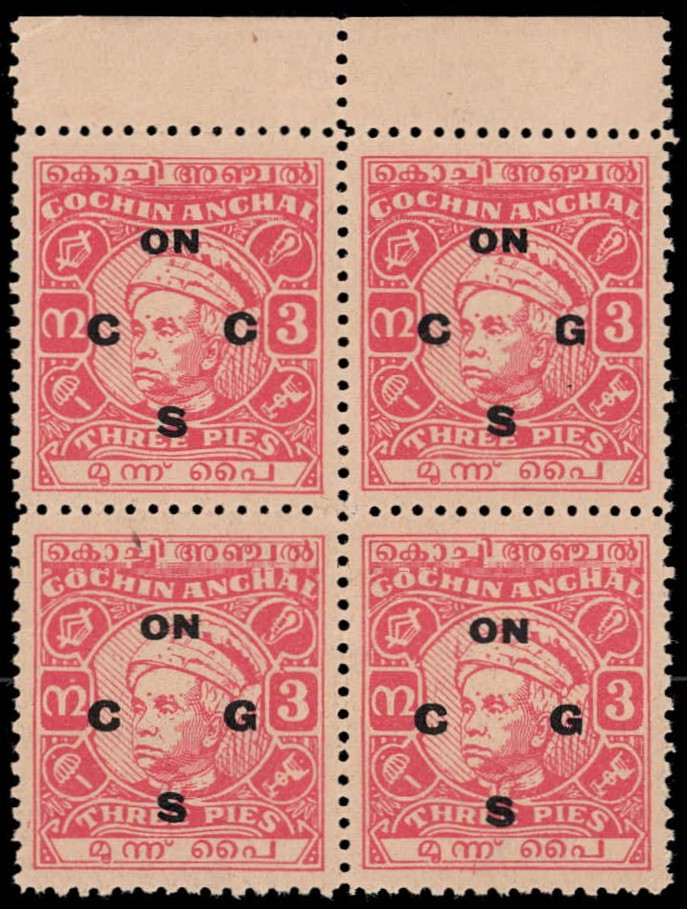 1948-49 3p carmine marginal block of 4 with error, top-left stamp with "C" for "G" on ON C G S overprint. Unused without gum as issued