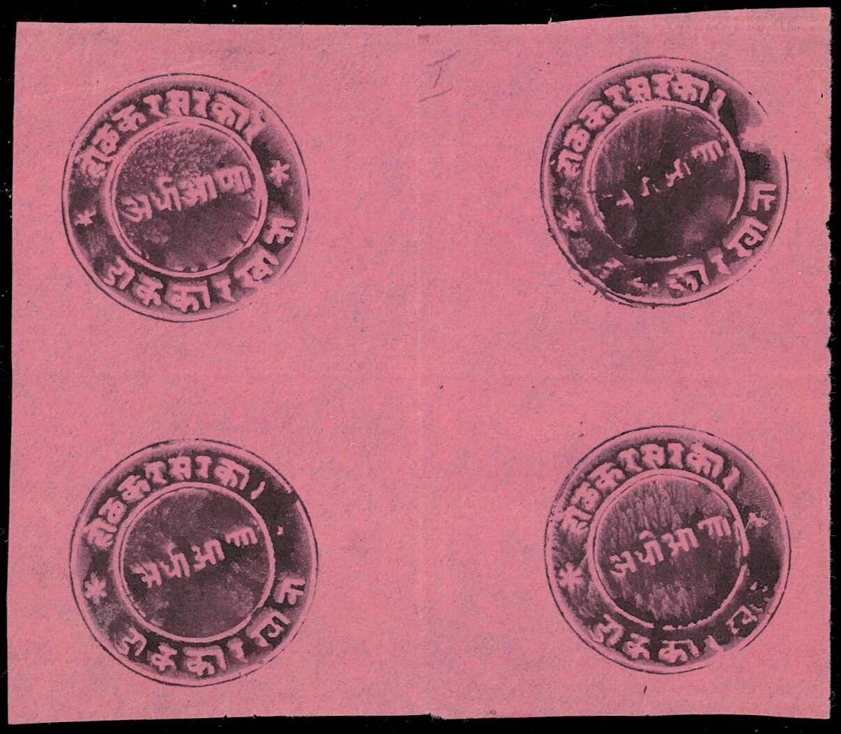 1889 ½a black on pink SG Type I, block of four. Unused without gum as issued. Multiples of SG Type I are extremely rare, this being the 2nd largest multiple recorded.
